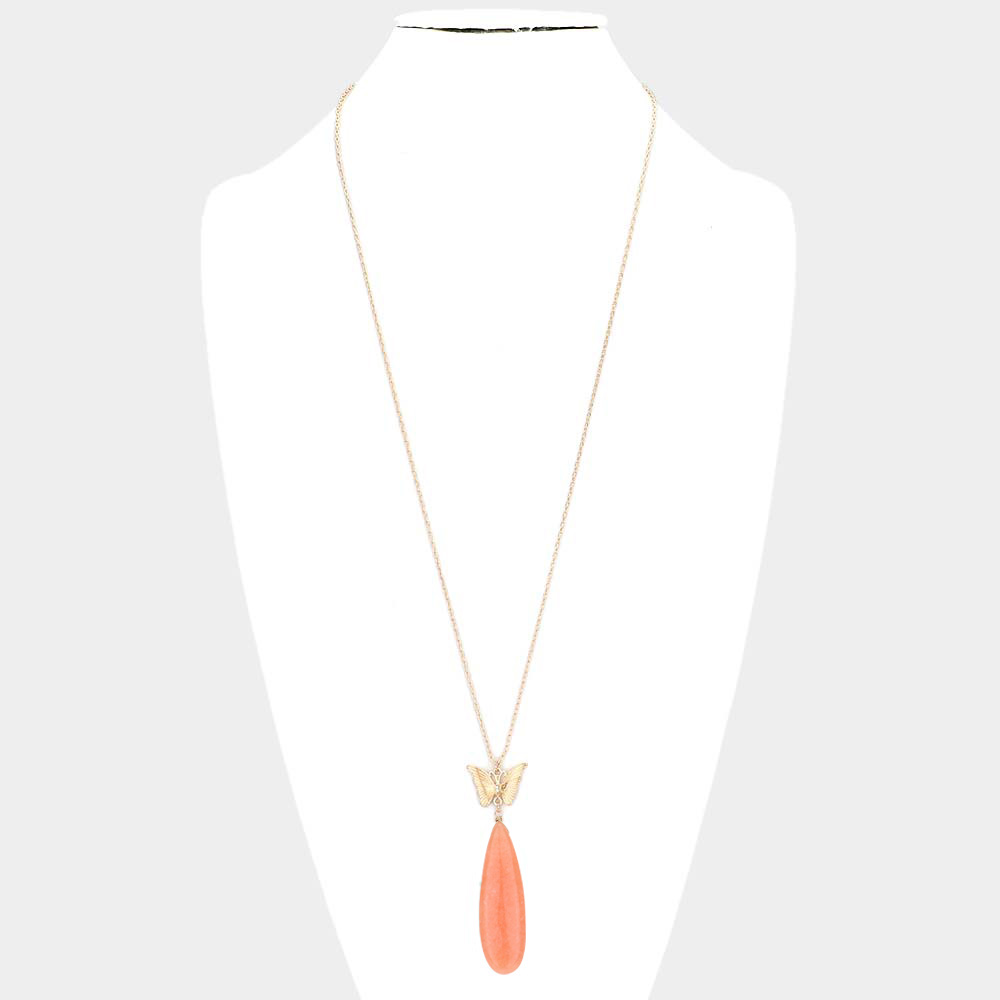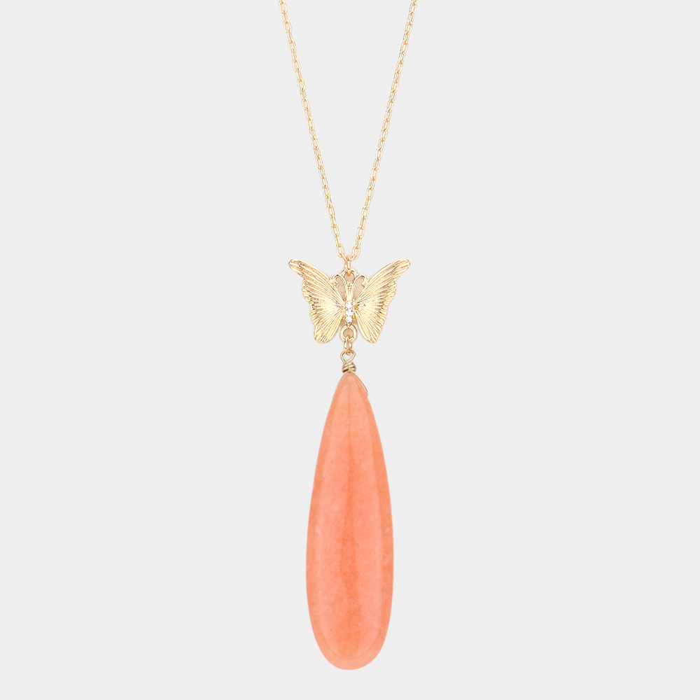 Butterfly Natural Stone Teardrop Link Pendant Long Necklace