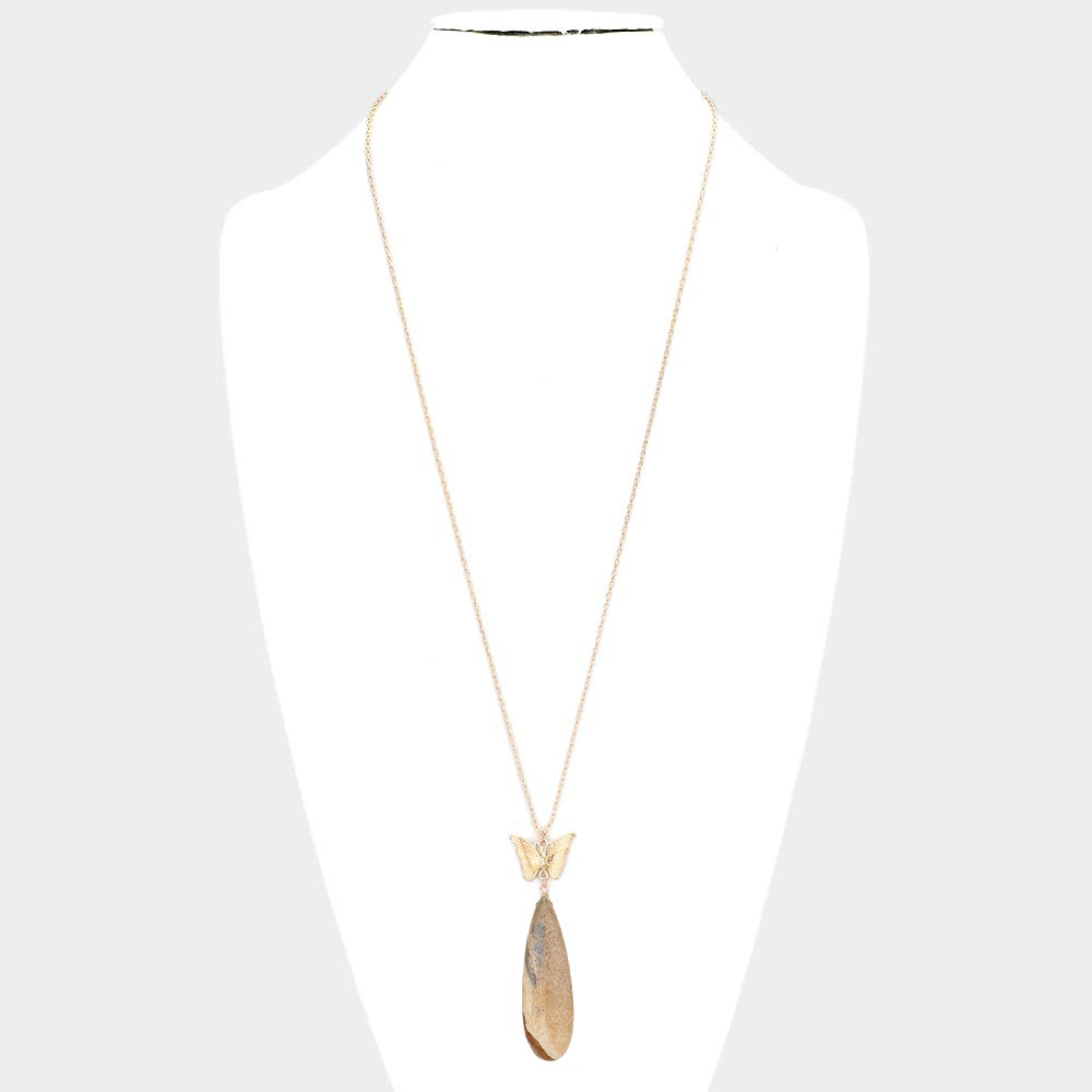 Butterfly Natural Stone Teardrop Link Pendant Long Necklace