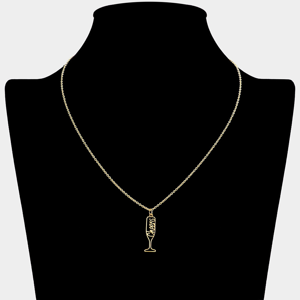 Cheers Message Wine Glass Brass Metal Pendant Necklace