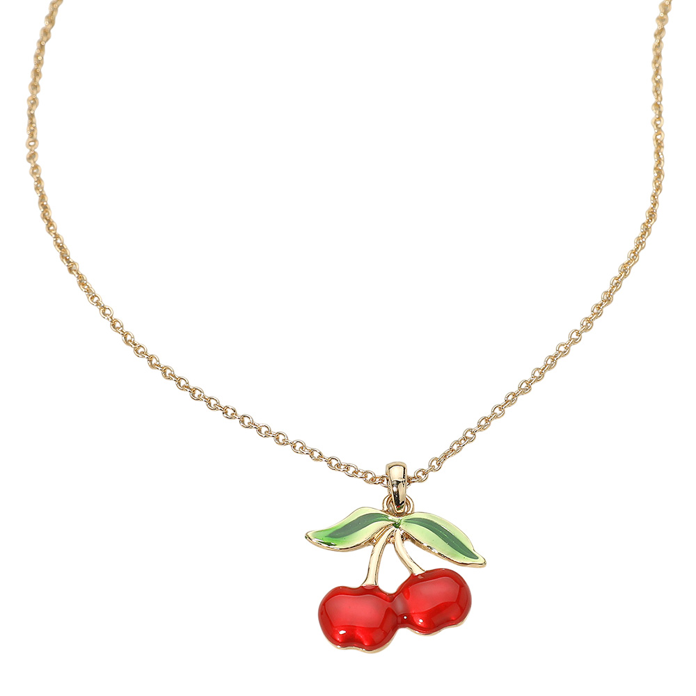 Details • Necklace Size : 16" + 3.5" L • Pendant Size : 1" X 1.25" • Show off your playful side with this cherry pendant necklace featuring glossy enamel detail and vibrant fruit charm design. A fun and trendy accessory, this necklace adds a touch of charm to any outfit, making it perfect for casual wear, layering, or gifting to someone who loves unique jewelry. • Lead and Nickel Compliant