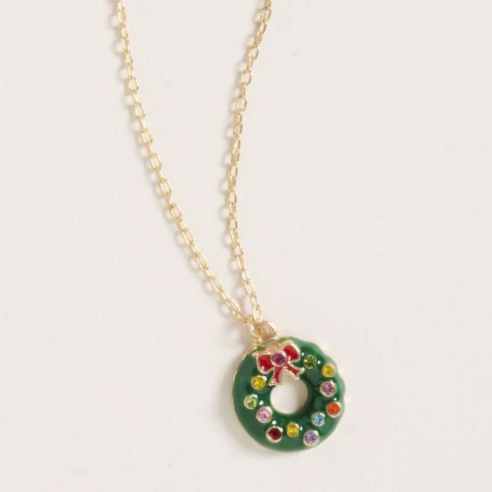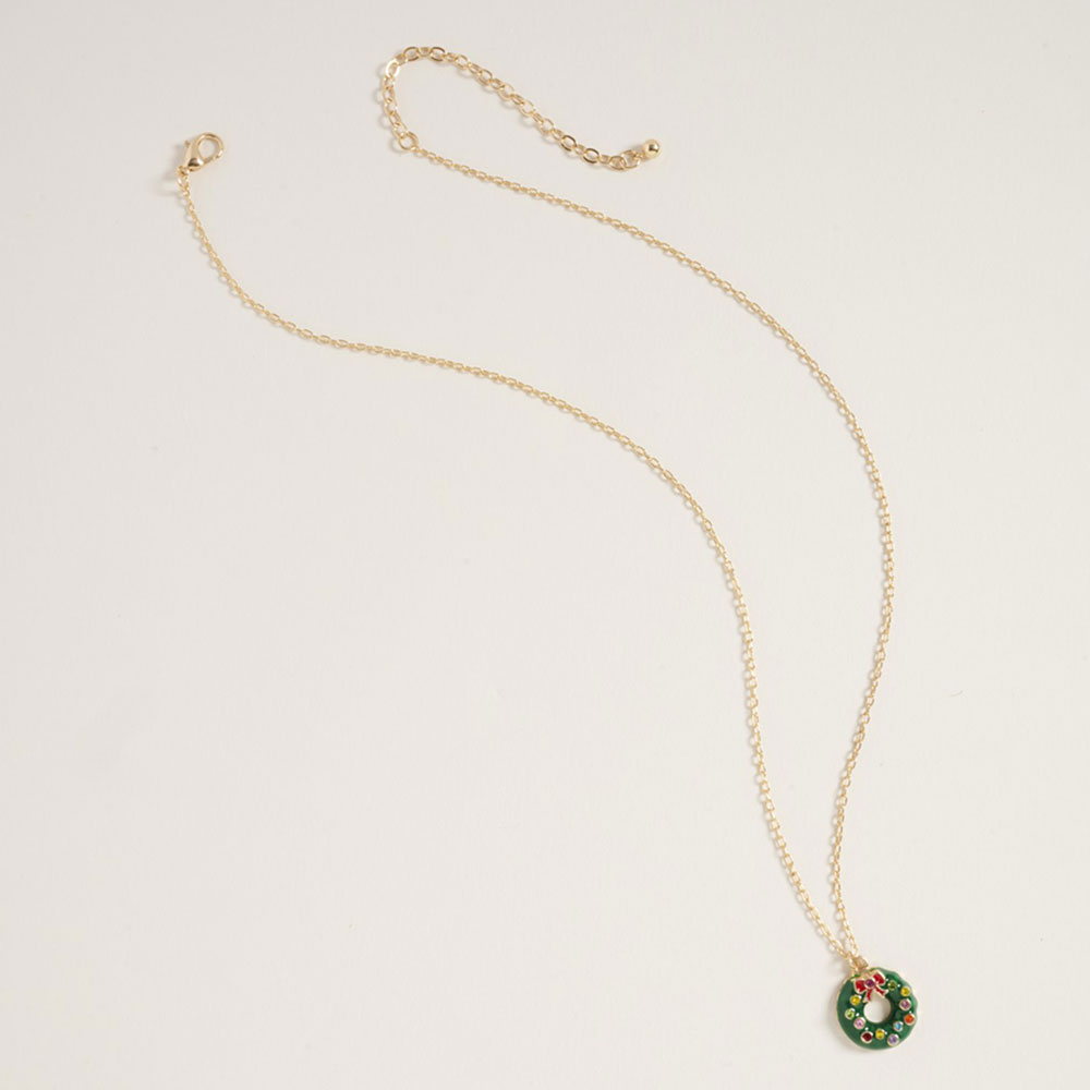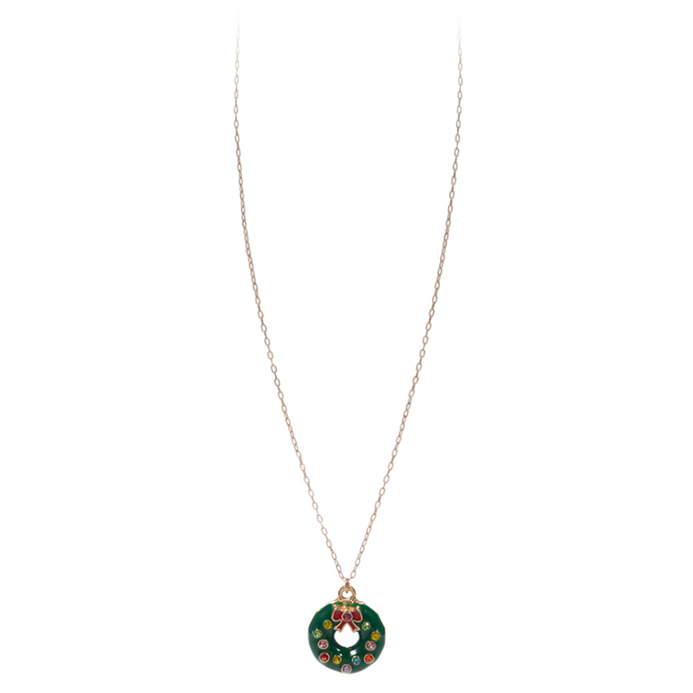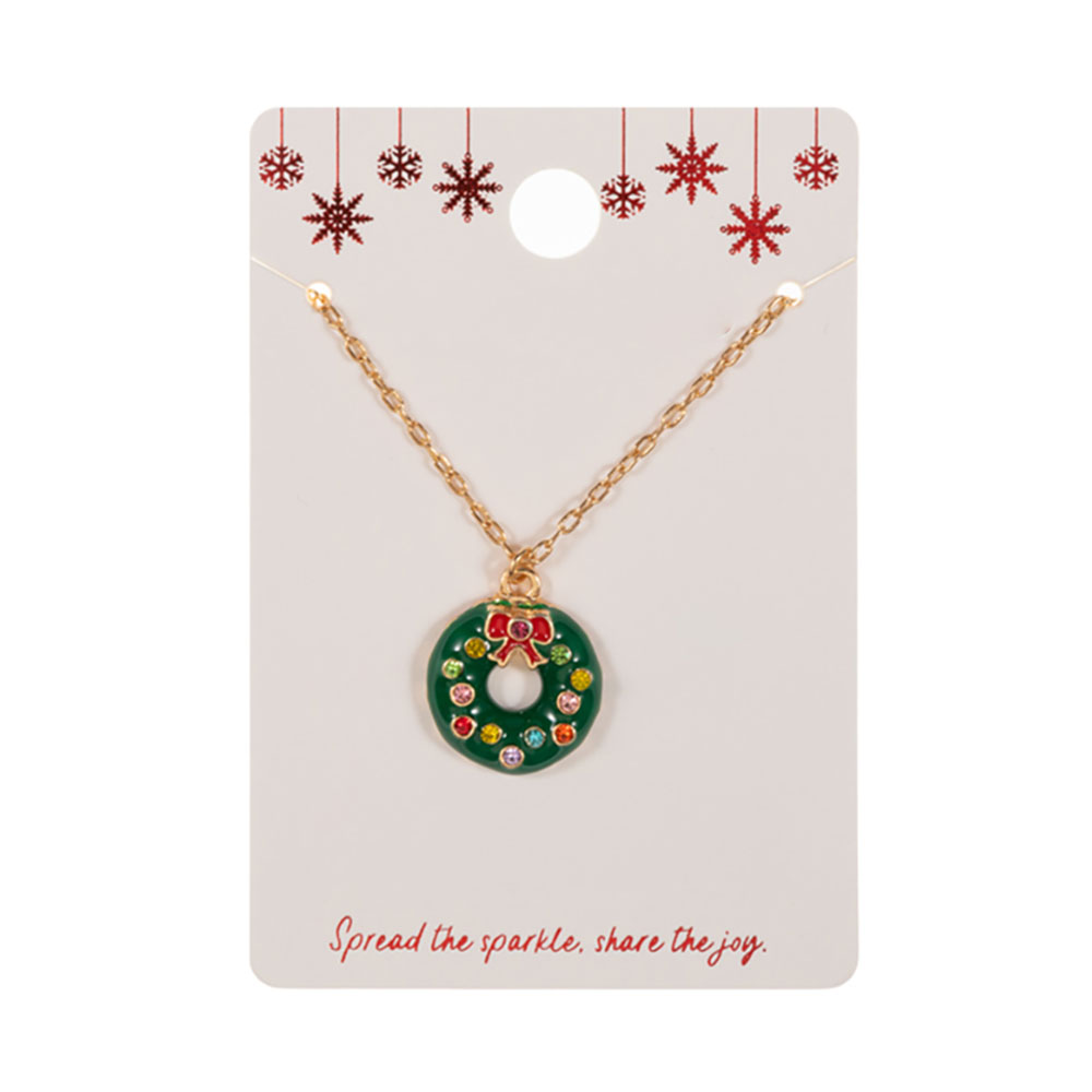 Details • Necklace Size : 18" + 3.5" L • Pendant Size : 0.6" X 0.8" • Add cheer to your outfit with this festive wreath pendant necklace, adorned with sparkling accents and a decorative bow. A delightful holiday piece perfect for seasonal celebrations or gifting. • Lead and Nickel Compliant