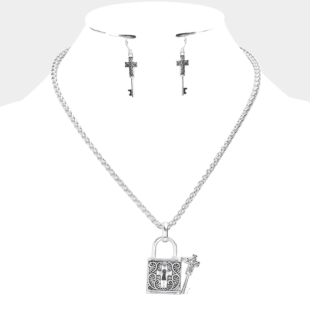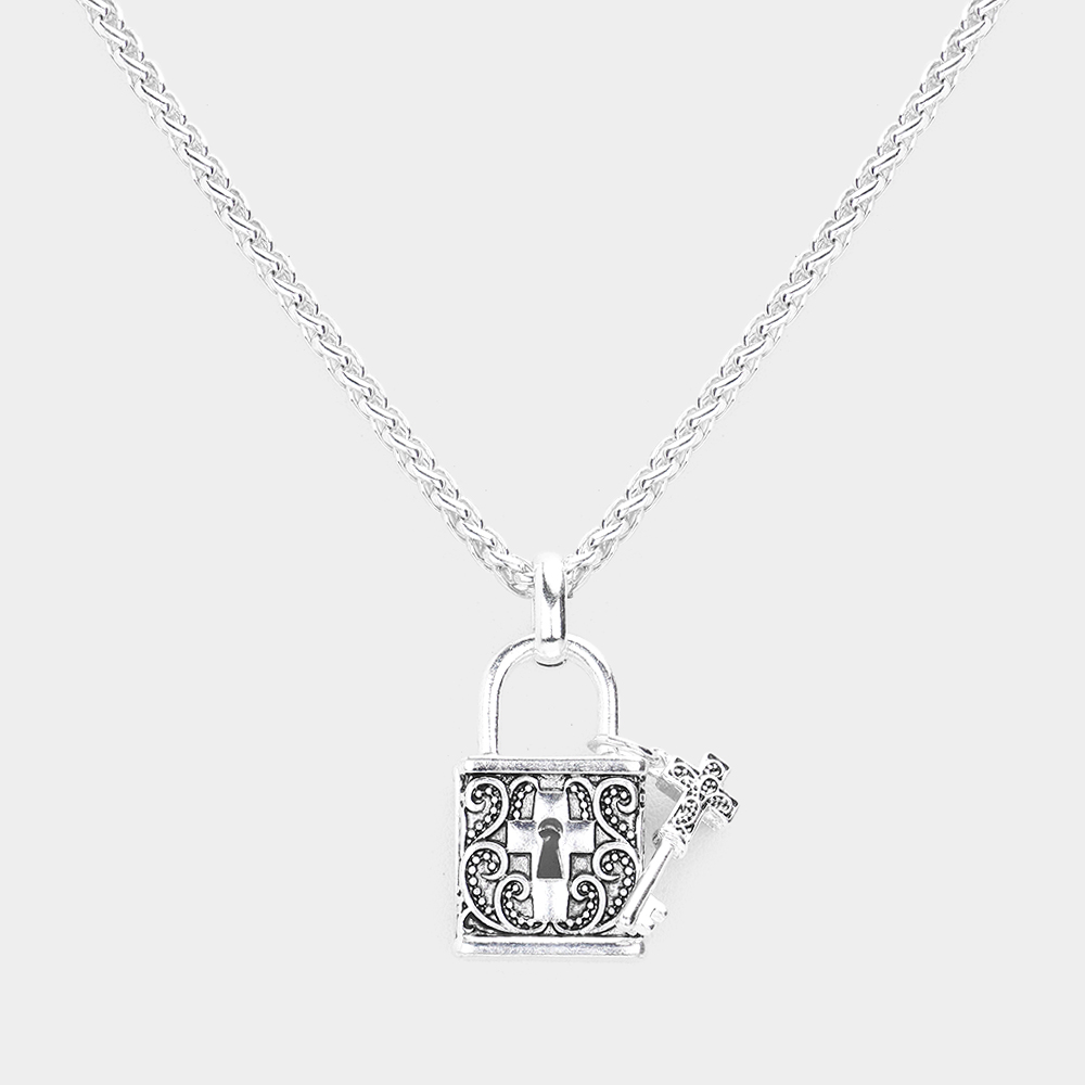 Cross Centered Metal Lock Key Pendant Necklace