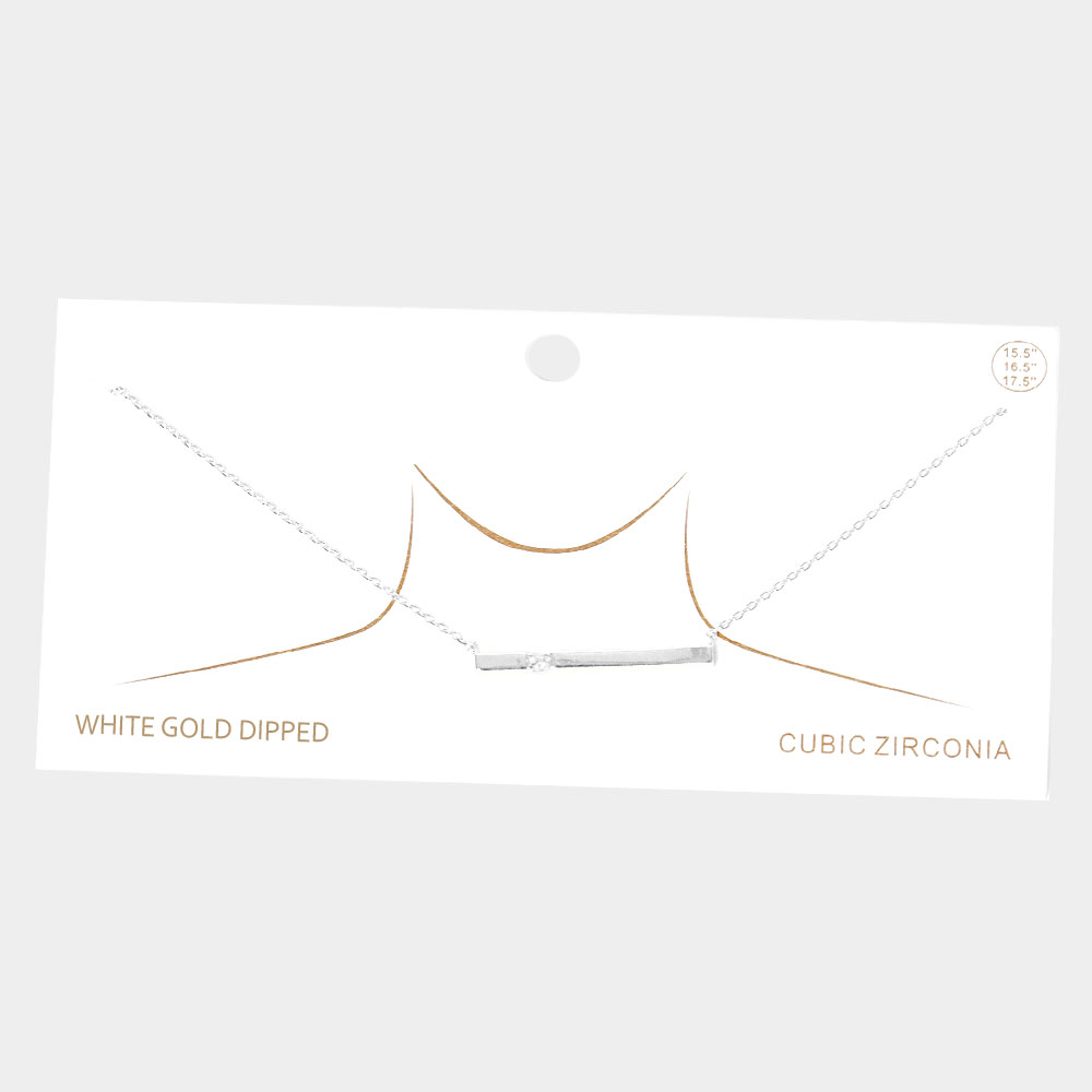 CZ Embellished White Gold Dipped Metal Bar Pendant Necklace