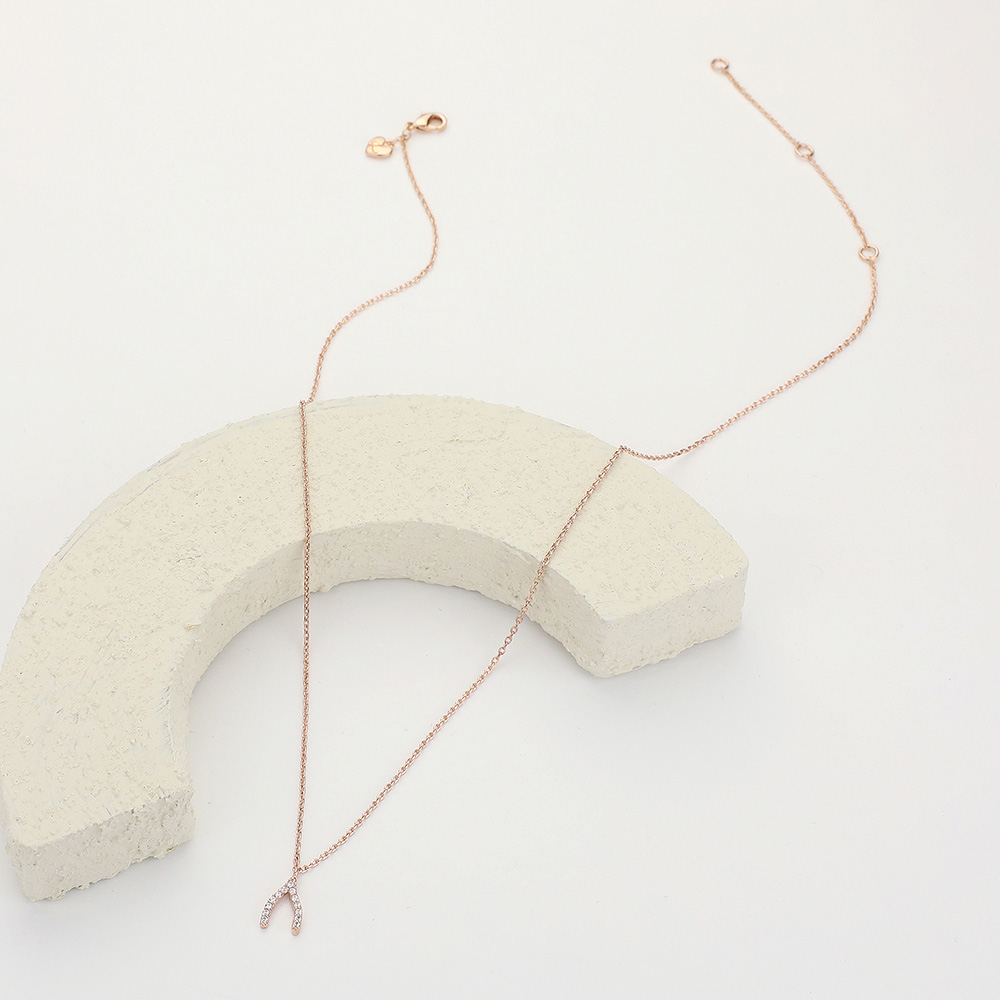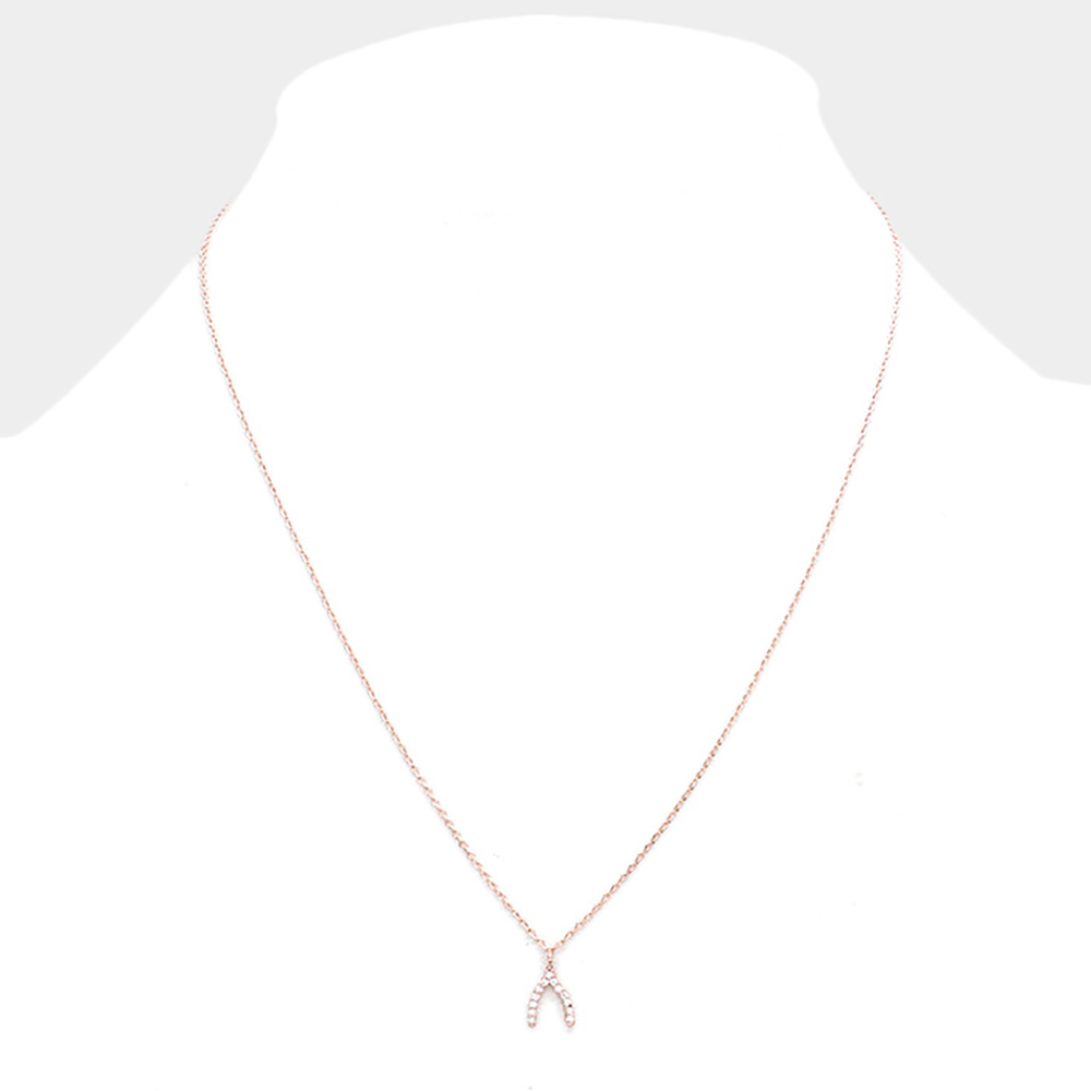 Rhinestone Embellished Brass Metal Wishbone Pendant Necklace
