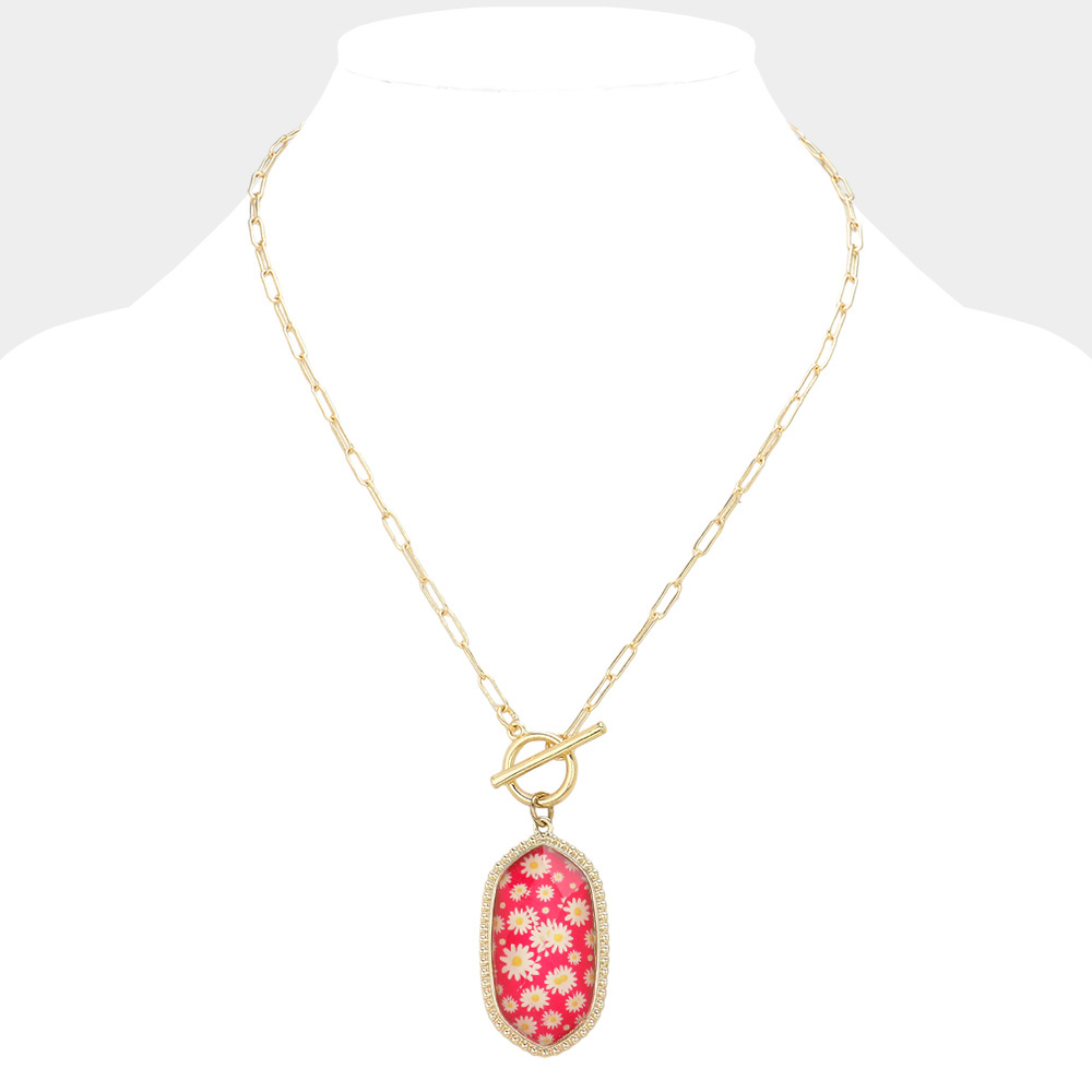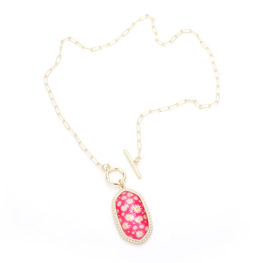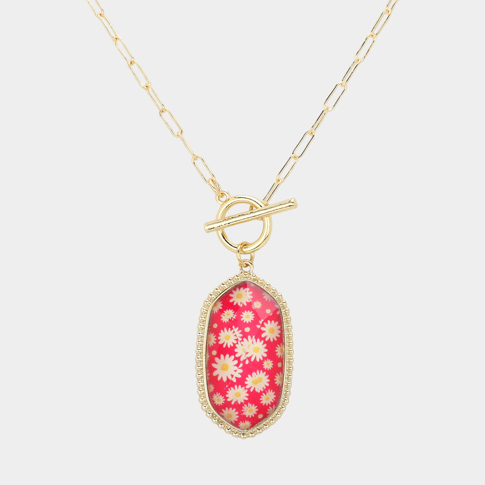 Daisy Flower Patterned Hexagon Pendant Toggle Necklace