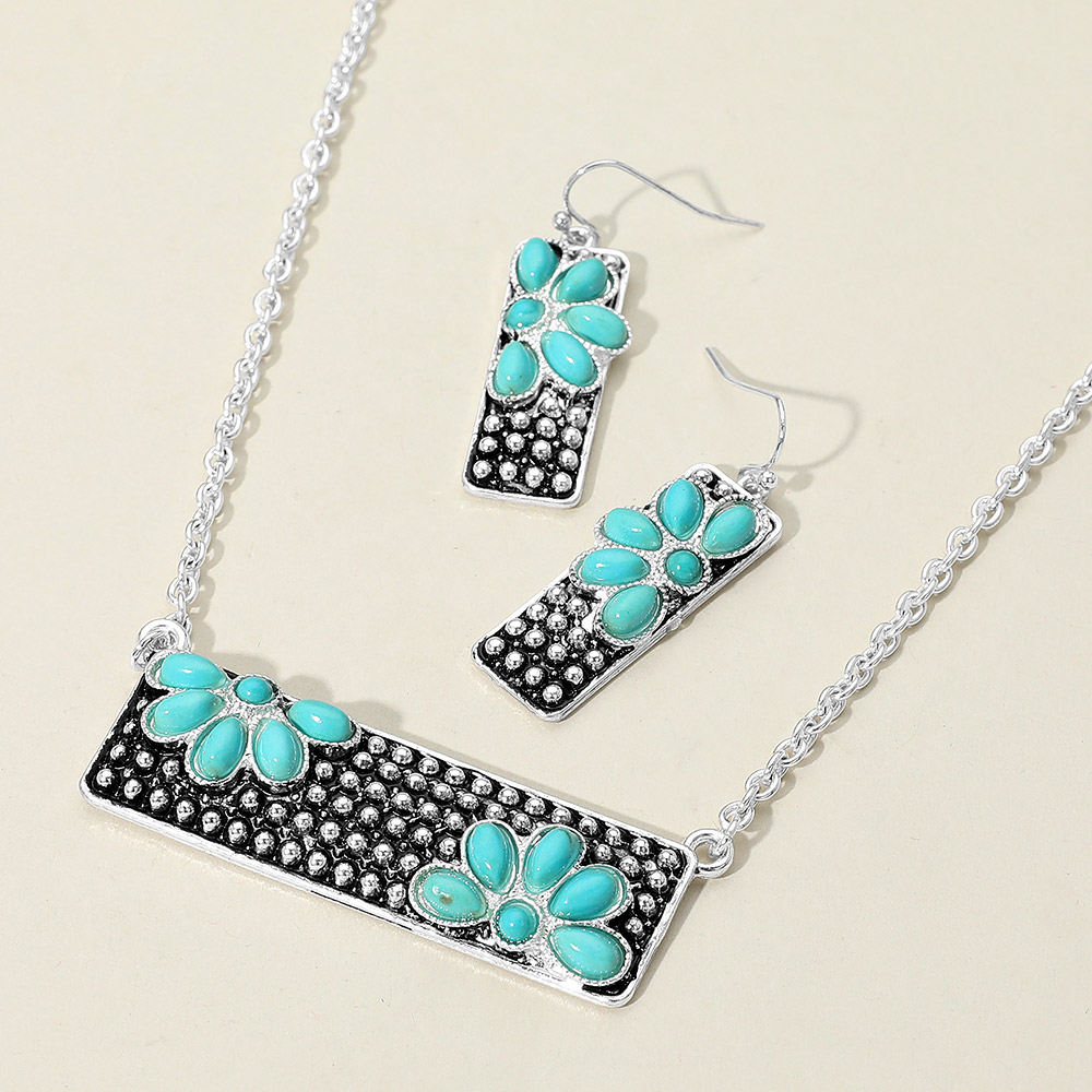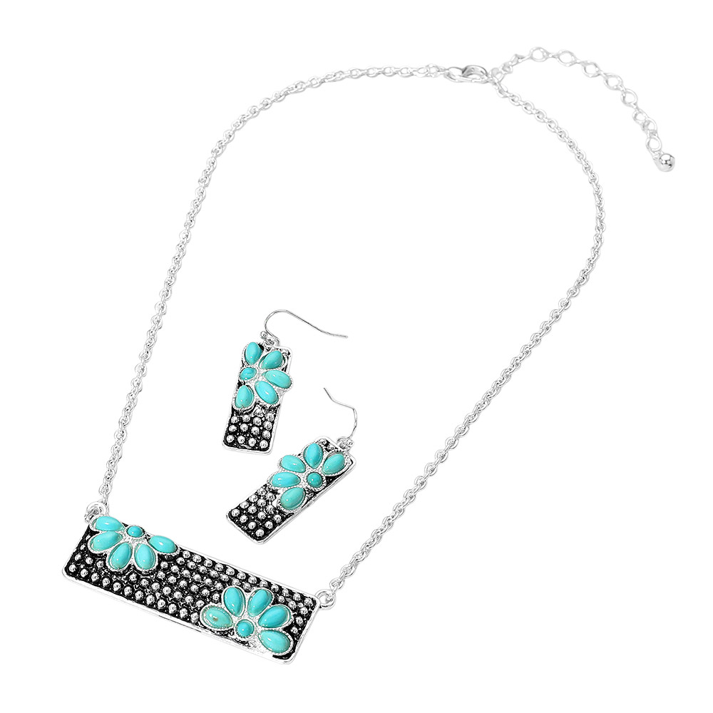 Details • Necklace Size : 18" + 3" L • Pendant Size : 2.25" X 0.75" • Earrings Size : 1.75" L • Chic jewelry set featuring a rectangular pendant necklace and matching earrings, accented with floral motifs and textured design. A stylish combo that elevates both casual and formal looks with subtle elegance. • Lead and Nickel Compliant