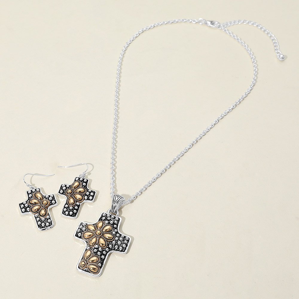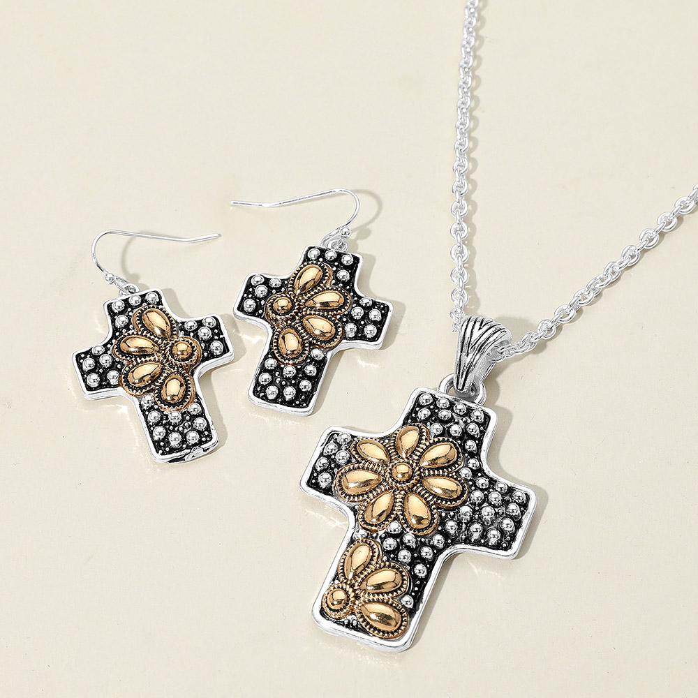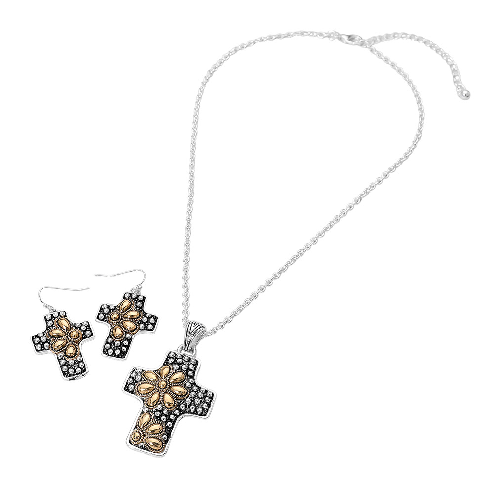 Details • Necklace Size : 18" + 3" L • Pendant Size : 1.3" X 2.3" • Earrings Size : 1.75" L • Elegant jewelry set featuring a cross pendant necklace and coordinating earrings with intricate floral accents and textured detail. A graceful blend of symbolic charm and modern style perfect for everyday or special occasions. • Lead and Nickel Compliant