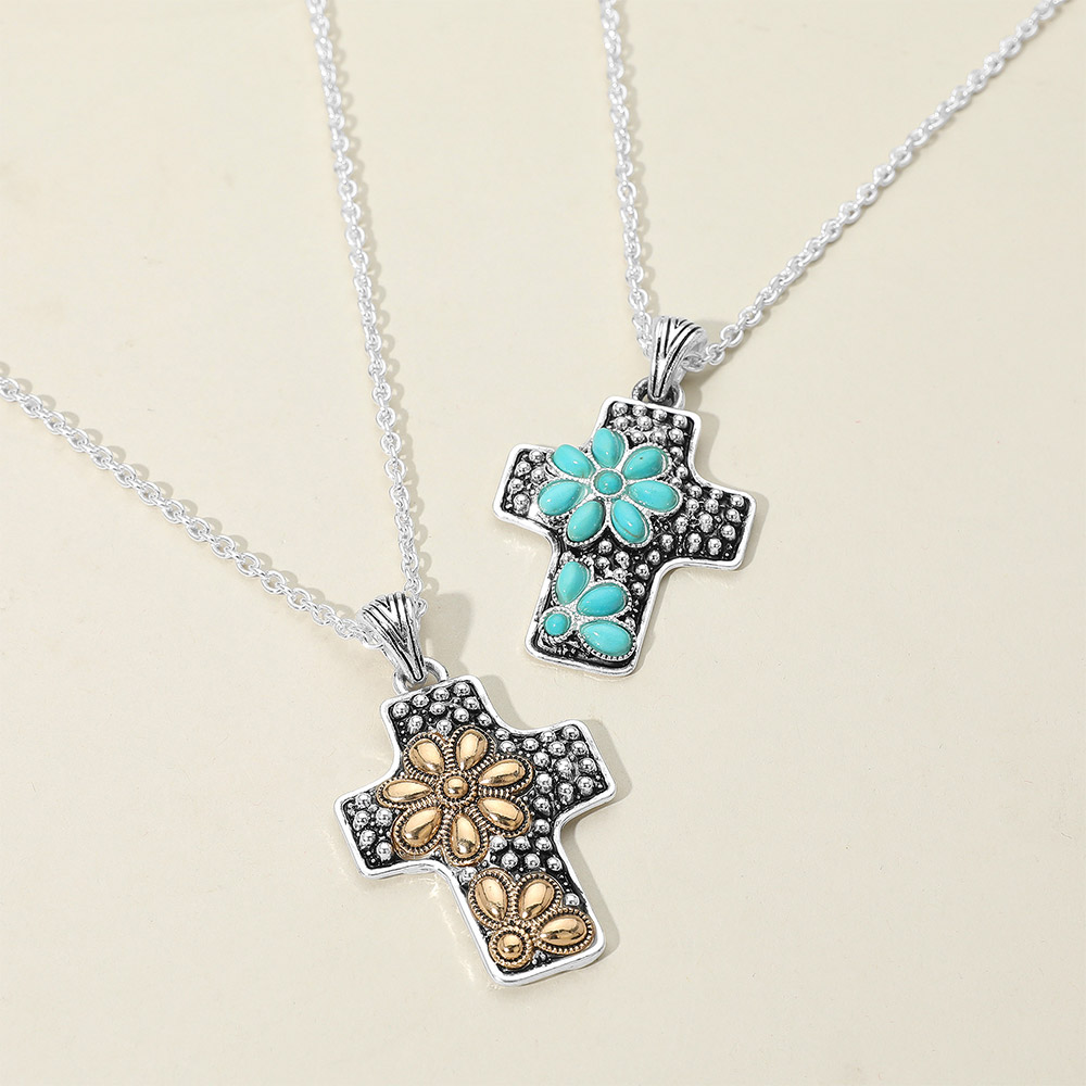 Embossed Floral Pattern Textured Metal Cross Pendant Necklace