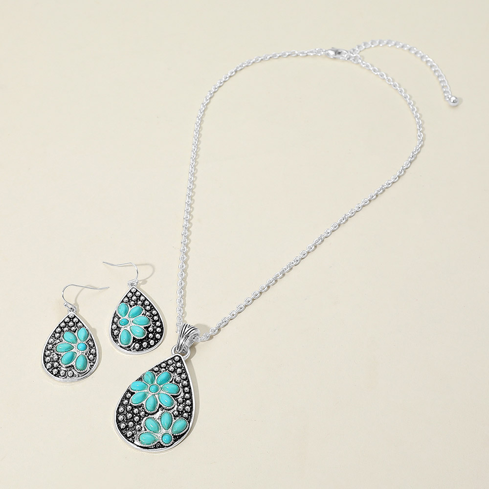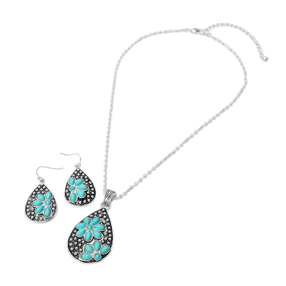Details • Necklace Size : 18" + 3" L • Pendant Size : 1.2" X 2.3" • Earrings Size : 1.75" L • Graceful teardrop-shaped jewelry set featuring a detailed pendant necklace and matching earrings with charming floral designs and textured accents. Ideal for adding a touch of elegance to casual or special occasion looks. • Lead and Nickel Compliant