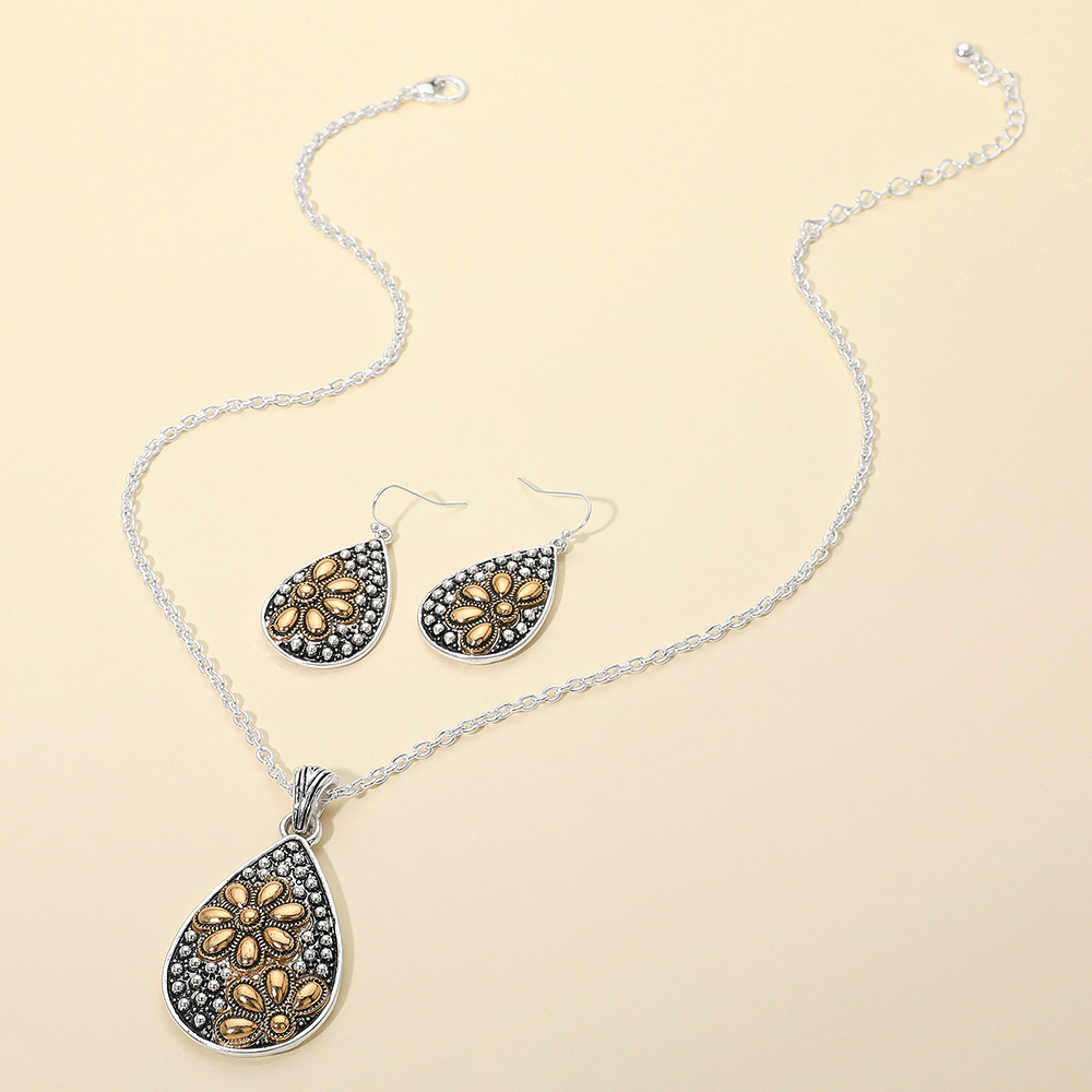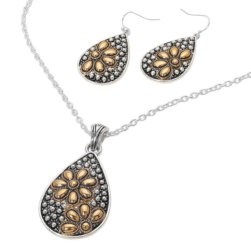 Details • Necklace Size : 18" + 3" L • Pendant Size : 1.2" X 2.3" • Earrings Size : 1.75" L • Graceful teardrop-shaped jewelry set featuring a detailed pendant necklace and matching earrings with charming floral designs and textured accents. Ideal for adding a touch of elegance to casual or special occasion looks. • Lead and Nickel Compliant