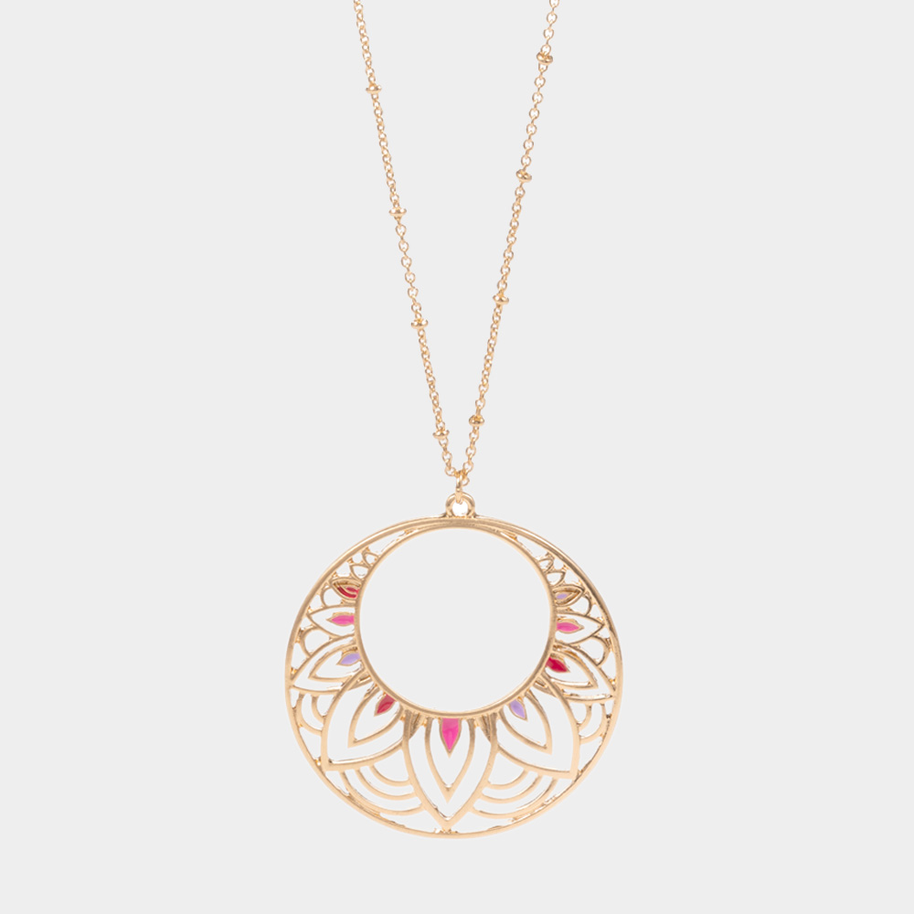 Enamel Detailed Cutout Metal Round Pendant Long Necklace