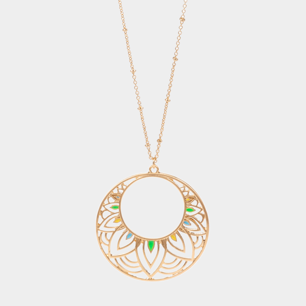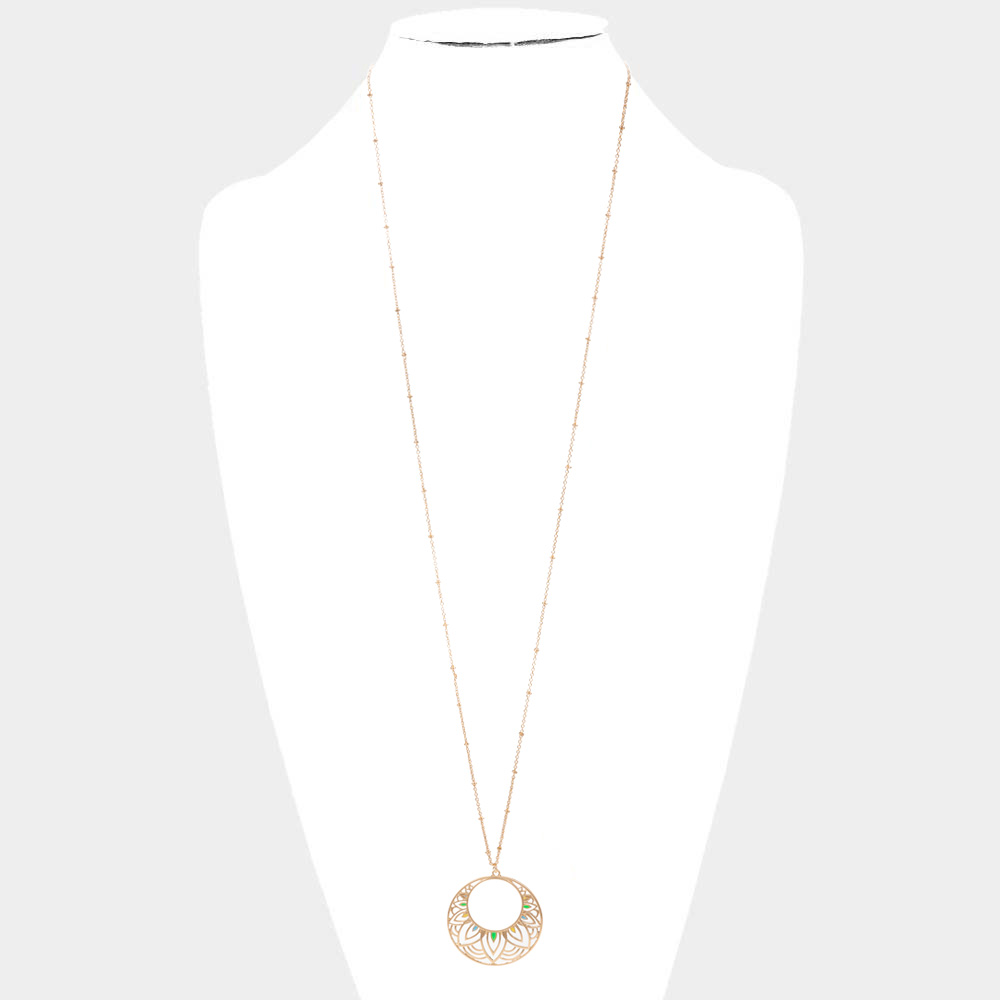 Enamel Detailed Cutout Metal Round Pendant Long Necklace