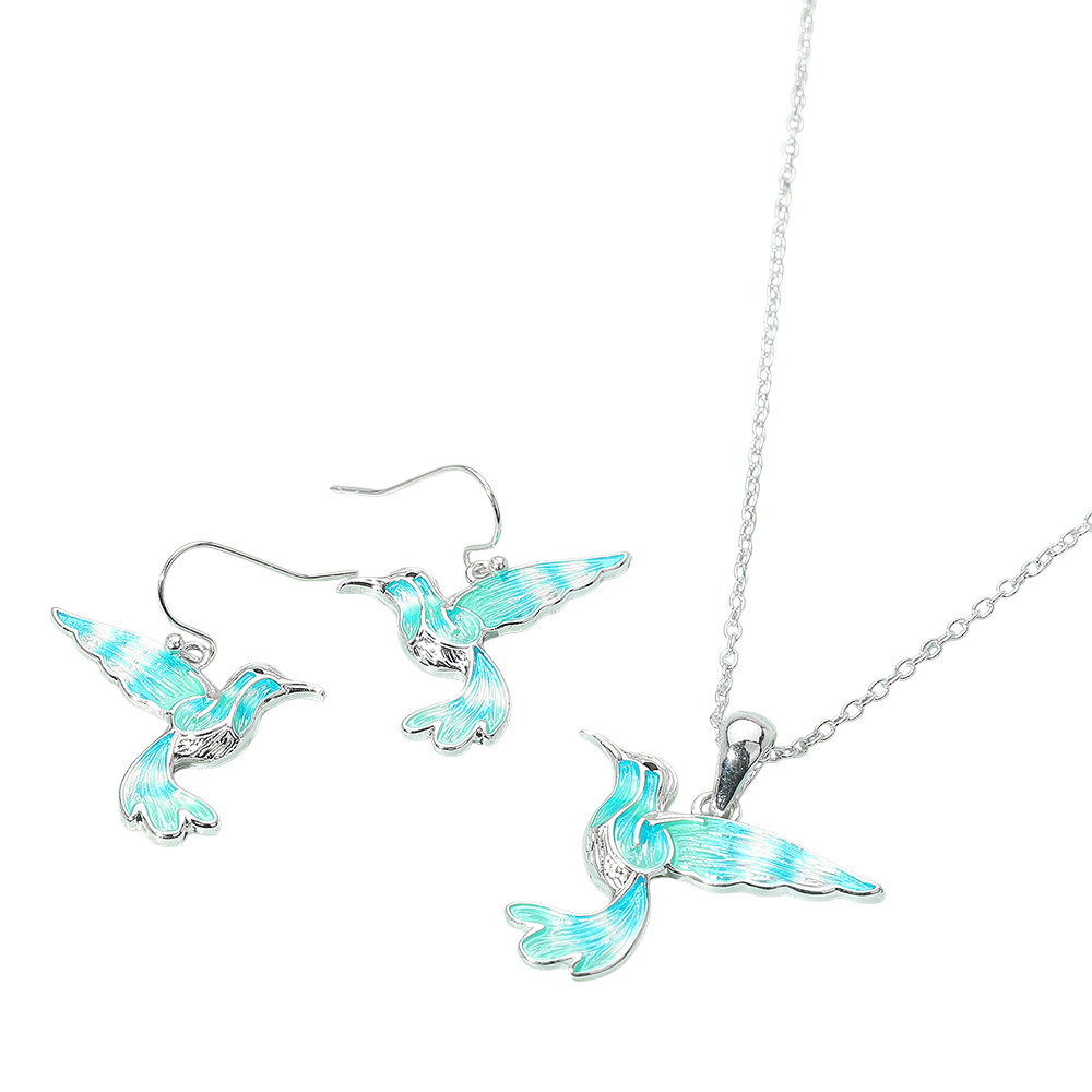 Details • Necklace Size : 18" + 3.25" L • Pendant Size : 1.25" X 1.25" • Earrings Size : 1.25" L • This hummingbird enamel necklace and earring set captures the grace and vitality of nature’s most delicate flyer. Designed with intricate details, it symbolizes joy and lightness, adding an elegant touch to your look. Perfect for everyday wear or as a meaningful gift choice. • Lead and Nickel Compliant