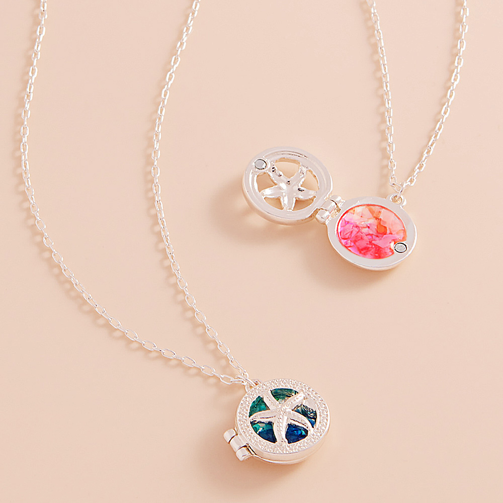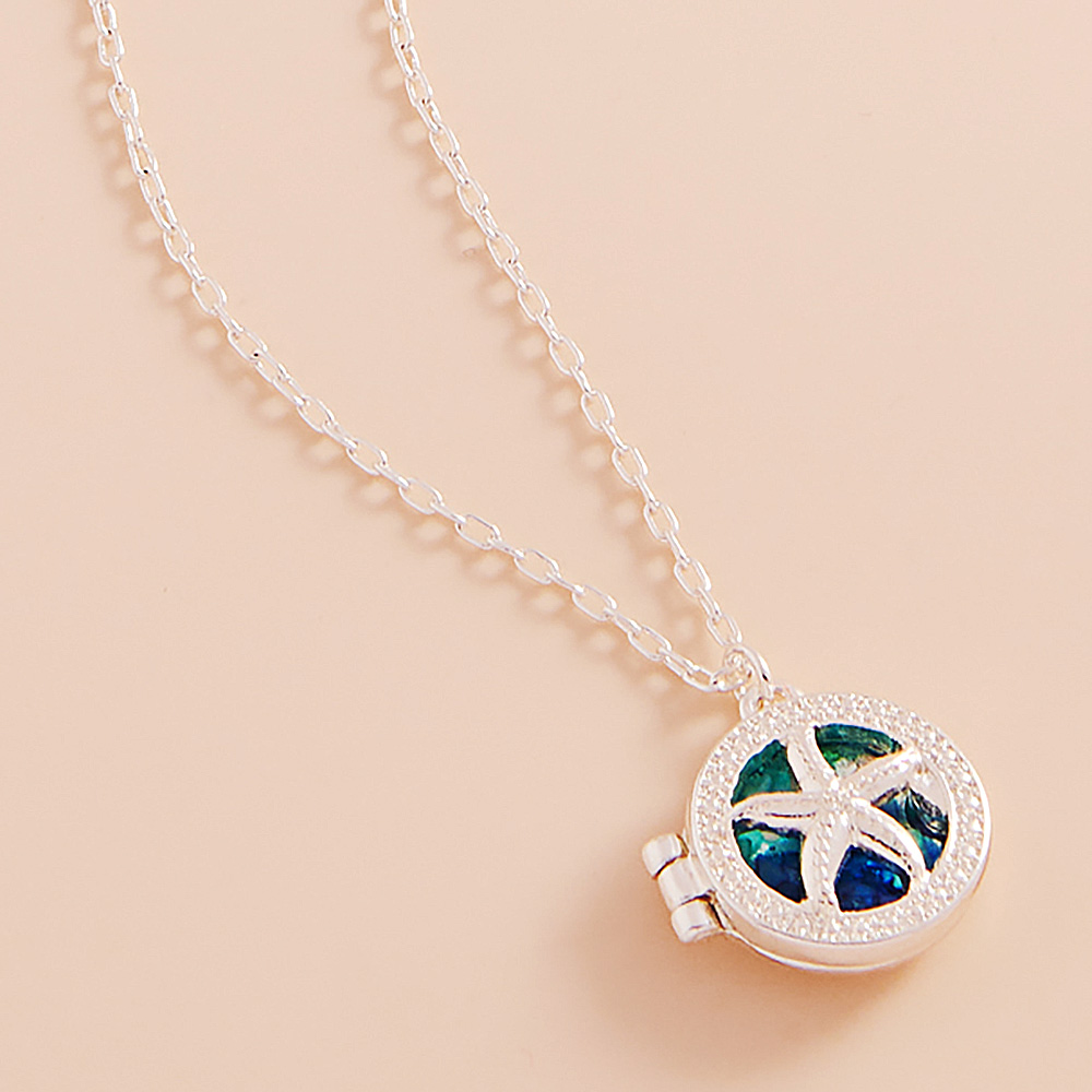 Details • Necklace Size : 17.25" + 3" L • Pendant Size : 0.6" X 0.6" • Charming round locket necklace featuring a starfish cutout over a textured background. A unique piece ideal for beach lovers and those seeking ocean-themed accessories. • Lead and Nickel Compliant