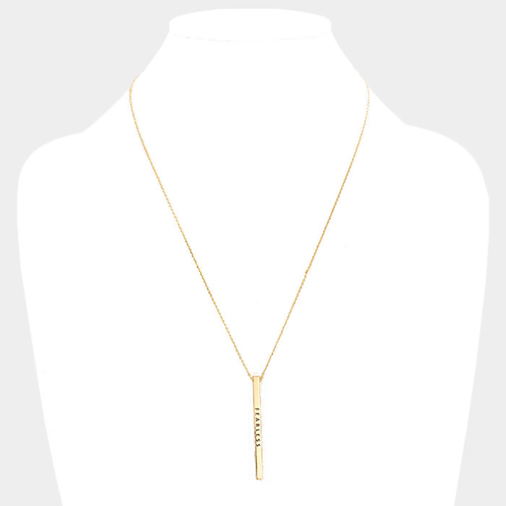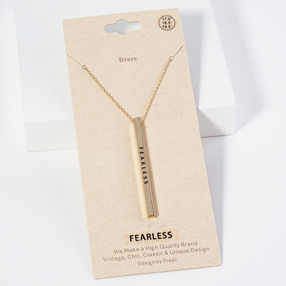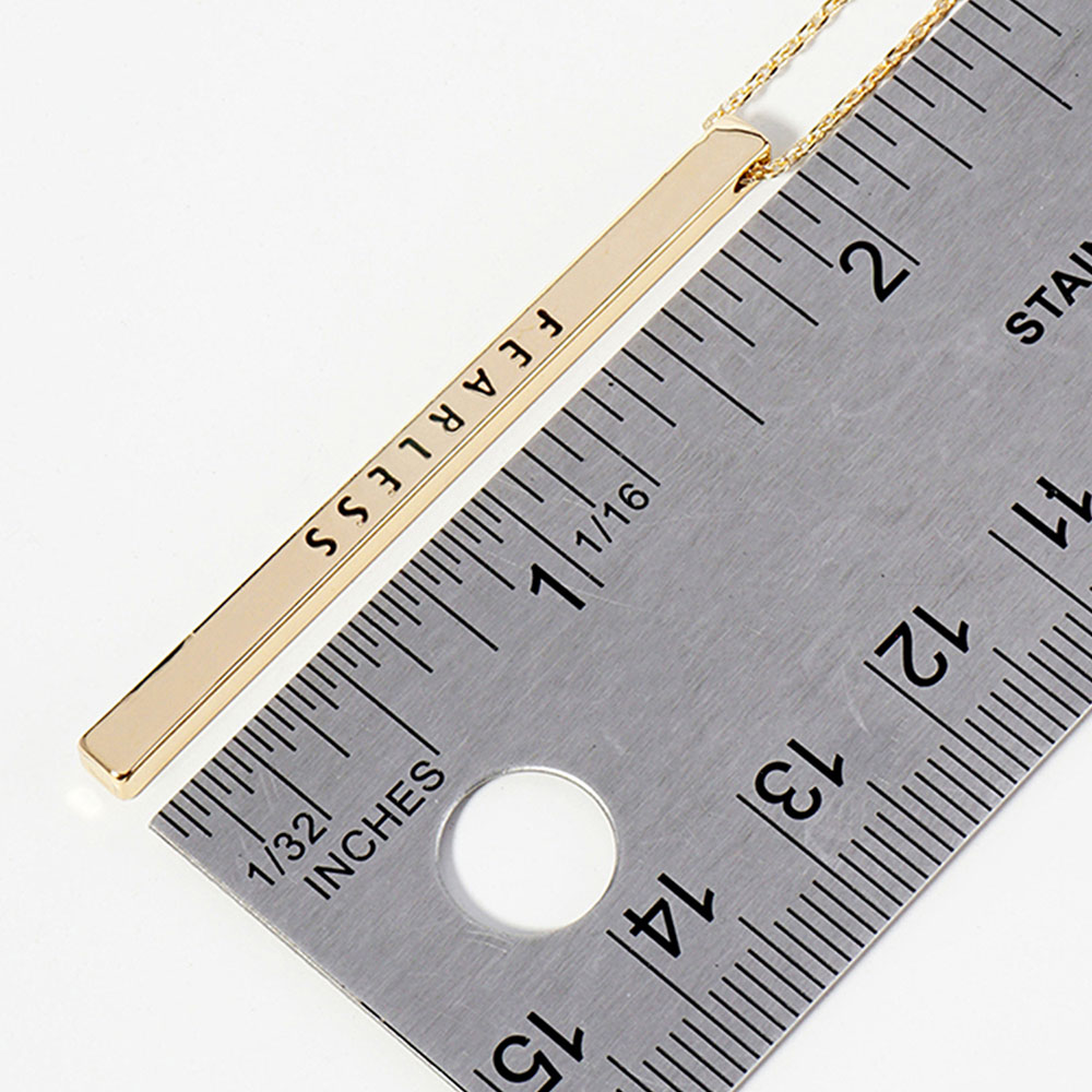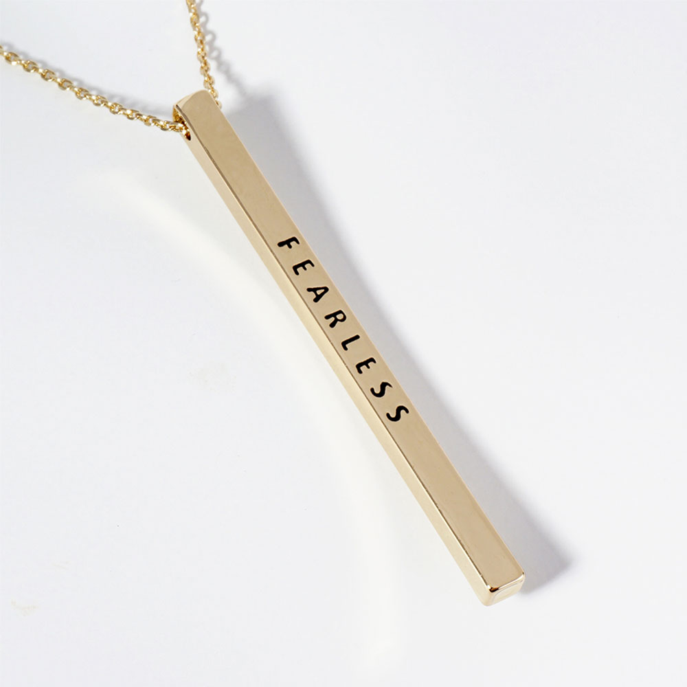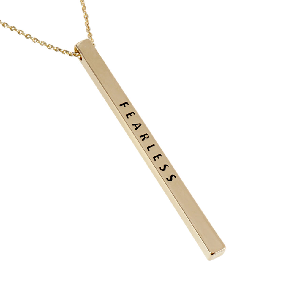 Details • Show inner strength with this engraved vertical bar necklace featuring the word “FEARLESS.” A powerful and motivational accessory designed to inspire courage and confidence. Ideal as a personal keepsake or meaningful gift for anyone embracing boldness and bravery. • Lead and Nickel Compliant • Brass