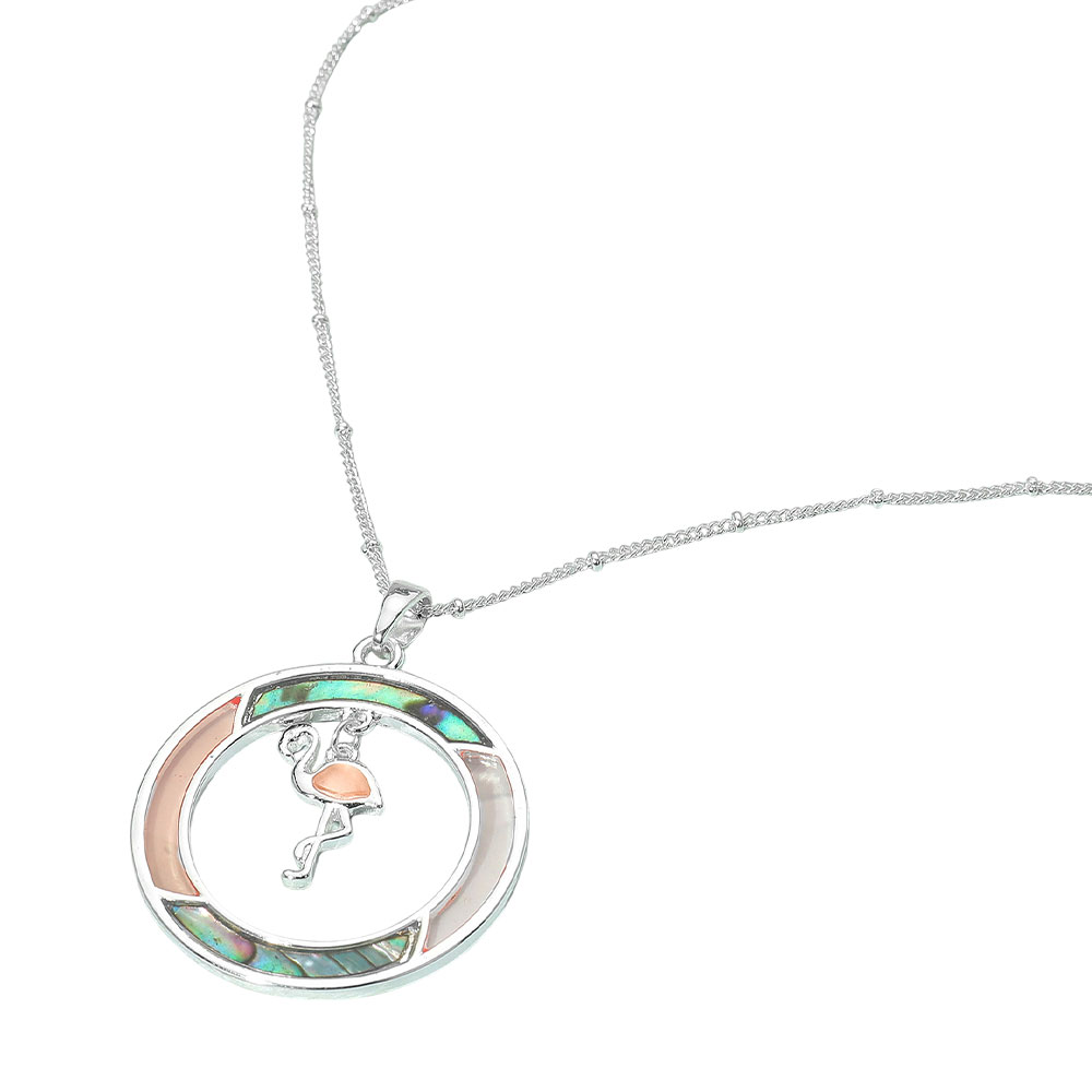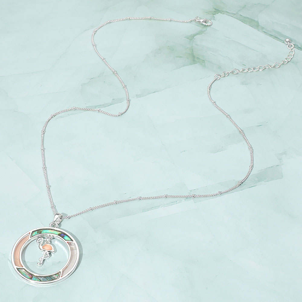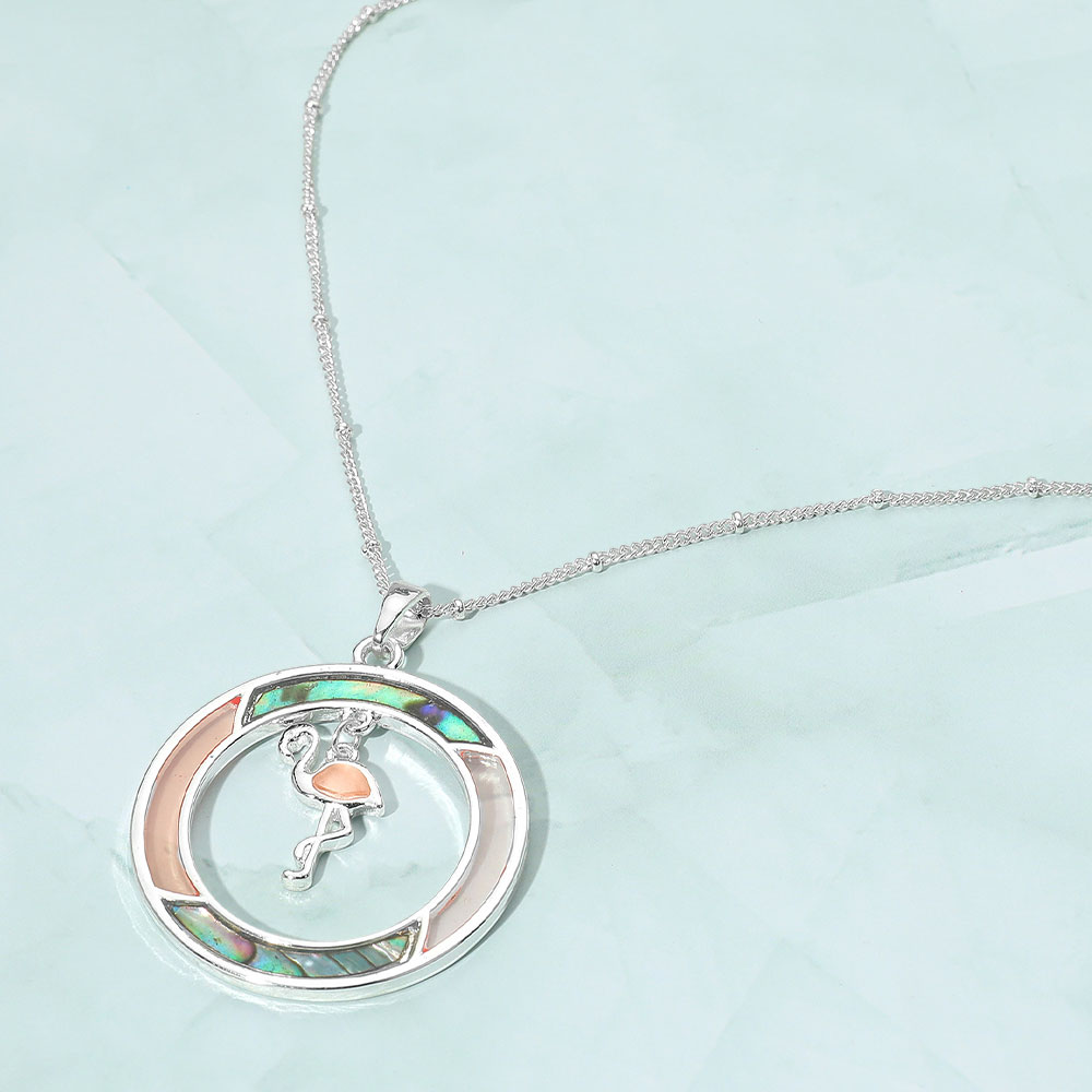 • Add tropical flair to your jewelry collection with this silver flamingo pendant necklace, featuring a stylish flamingo charm and a circular frame inlaid with abalone shell and soft peach enamel. Lightweight and beachy, it's perfect for summer outfits, vacations, or flamingo lovers. A fun and vibrant accessory for any look.