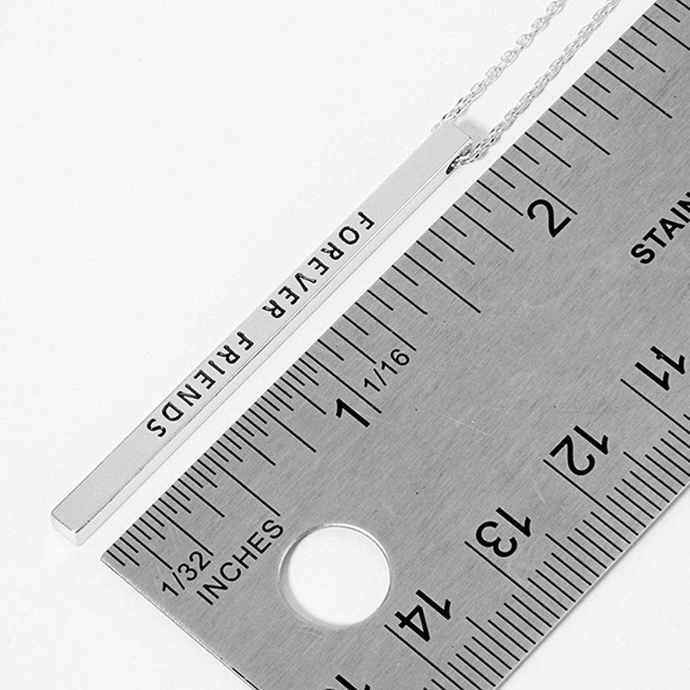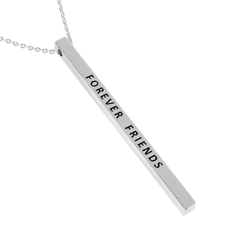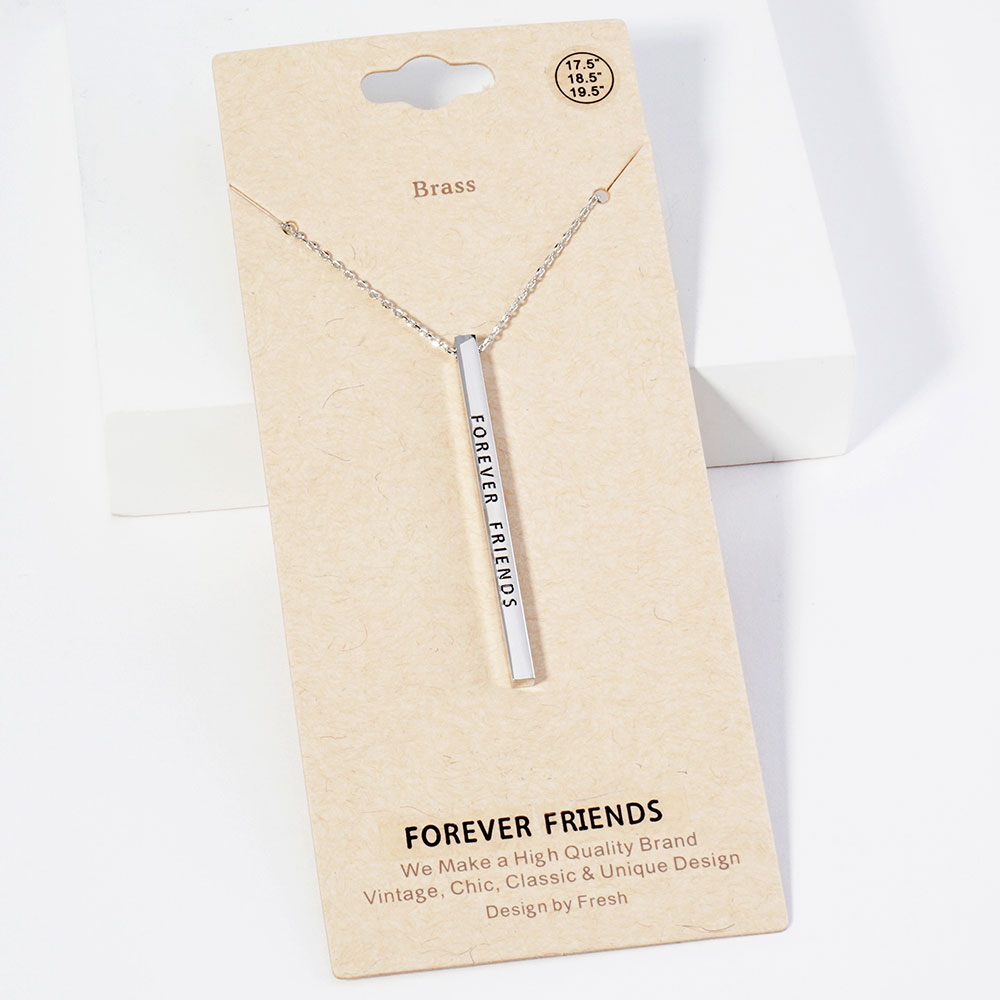 Details • Necklace Size : 19.5" + 2" L • Pendant Size : 0.2" X 2" • Celebrate lasting connections with this engraved vertical bar necklace featuring “FOREVER FRIENDS.” A heartfelt accessory that honors meaningful friendships. Ideal as a sentimental gift to show appreciation, love, and lifelong loyalty between best friends. • Lead and Nickel Compliant • Brass