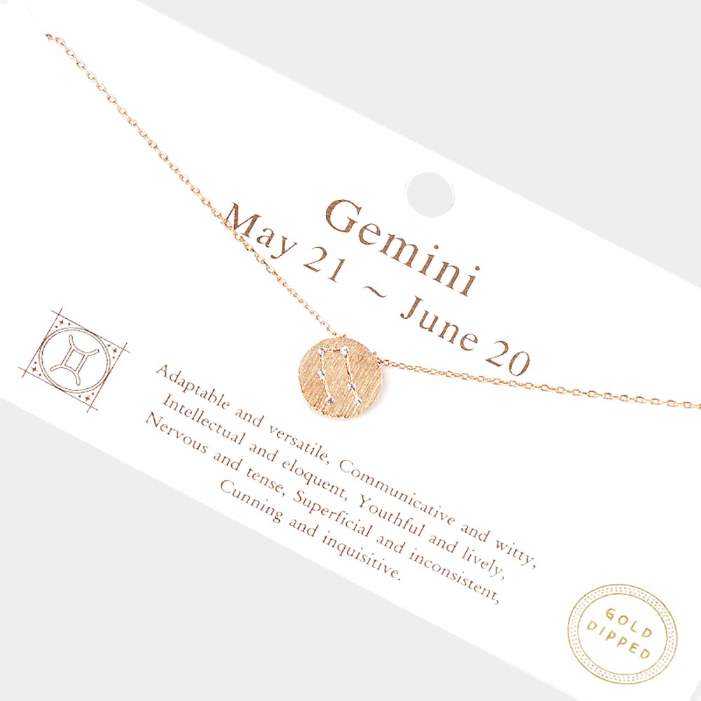 Gemini Gold Dipped CZ Zodiac Sign Metal Disc Pendant Necklace
