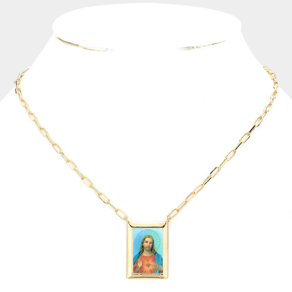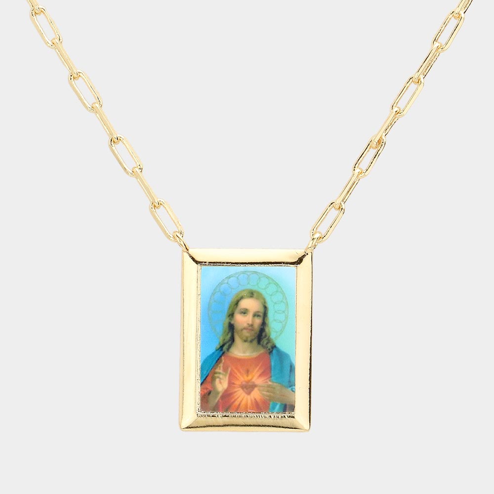 Gold Dipped Brass Metal Sacred Heart of Jesus Pendant Necklace