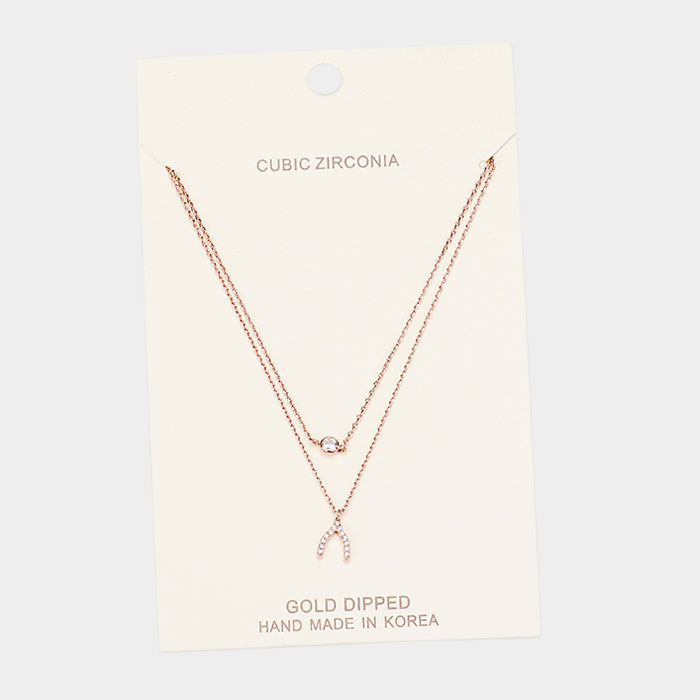 Gold Dipped Cubic Zirconia CZ Wishbone Pendant Necklace