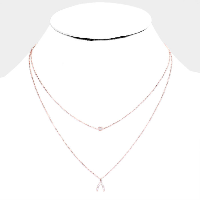 Rhinestone Embellished Brass Metal Wishbone Pendant Necklace