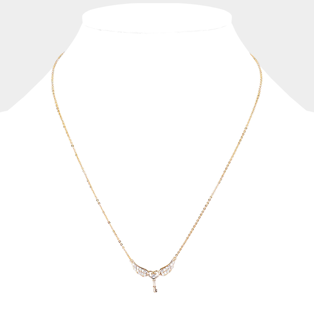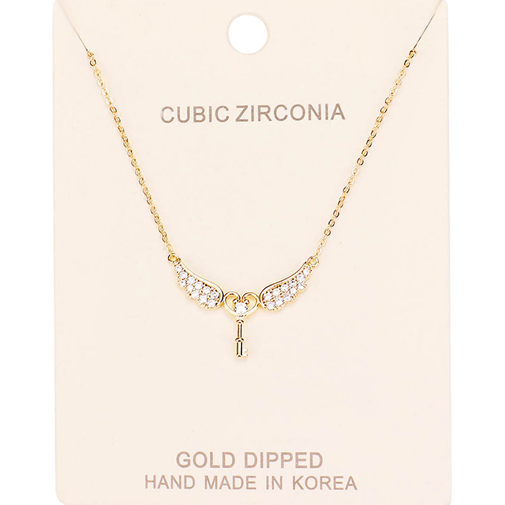 Gold Dipped CZ Angel Wings Key Pendant Necklace