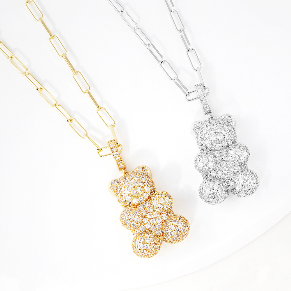 White Gold Dipped CZ Embellished Metal Bear Pendant Necklace