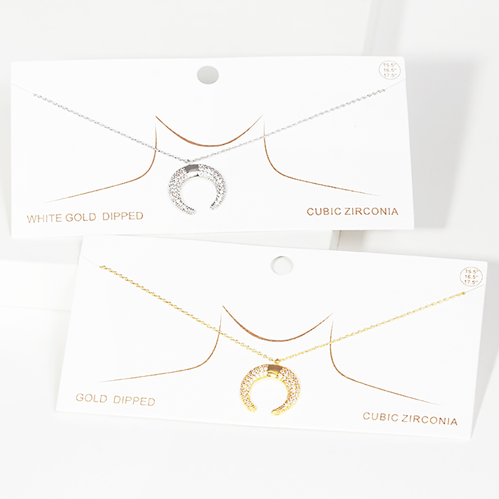 White Gold Dipped CZ Embellished Metal Horn Pendant Necklace