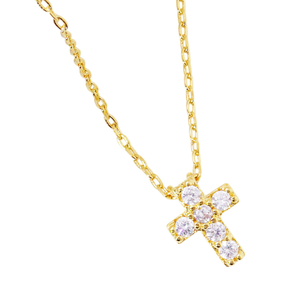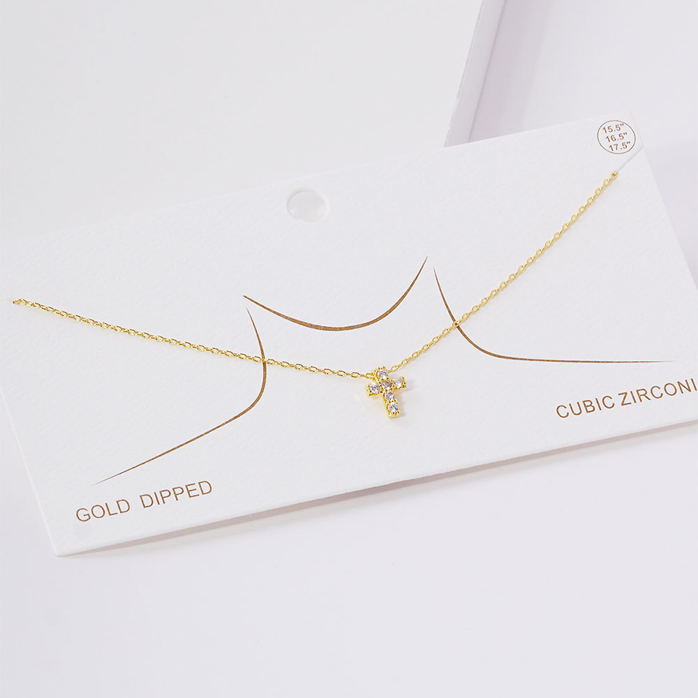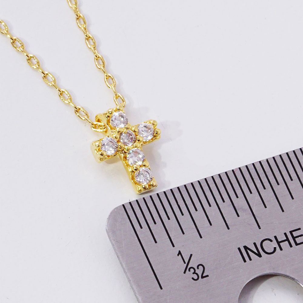 Details • Necklace Size : 15.5" + 2" L • Pendant Size : 0.3" X 0.4" • This dainty necklace features a classic cross pendant adorned with brilliant round crystals, offering a refined and elegant look. Perfect for daily wear or special occasions, it's a timeless accessory that carries a message of hope, strength, and grace. • CZ Cubic Zirconia • Gold Dipped • Lead and Nickel Compliant • Made In Korea