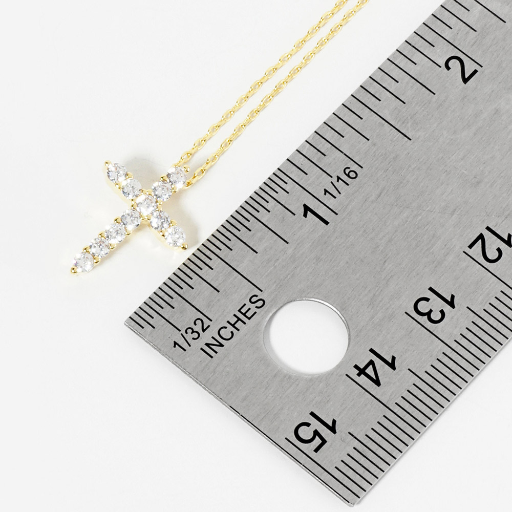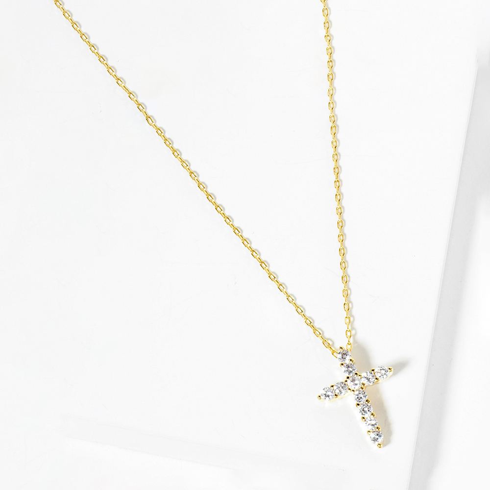 Details • Necklace Size : 15.5" + 2" L • Pendant Size : 0.5" X 0.75" • This dainty cross pendant necklace showcases timeless elegance with a sleek chain and sparkling accents. A versatile piece that adds a touch of grace and meaning to everyday wear or special occasions, perfect for layering or wearing solo. • Lead and Nickel Compliant • Made In Korea • Gold Dipped • CZ Cubic Zirconia