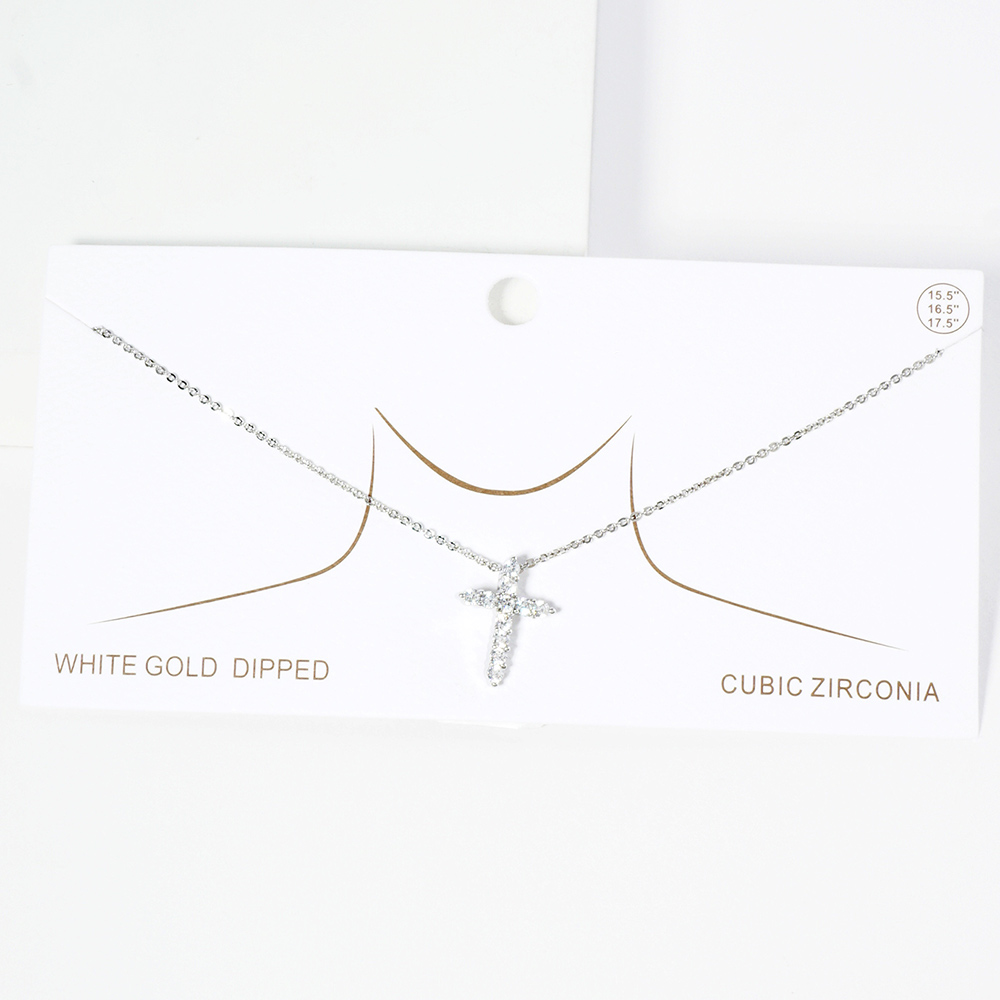 Details • Necklace Size : 15.5" + 2" L • Pendant Size : 0.5" X 0.75" • This dainty cross pendant necklace showcases timeless elegance with a sleek chain and sparkling accents. A versatile piece that adds a touch of grace and meaning to everyday wear or special occasions, perfect for layering or wearing solo. • Lead and Nickel Compliant • Made In Korea • Gold Dipped • CZ Cubic Zirconia