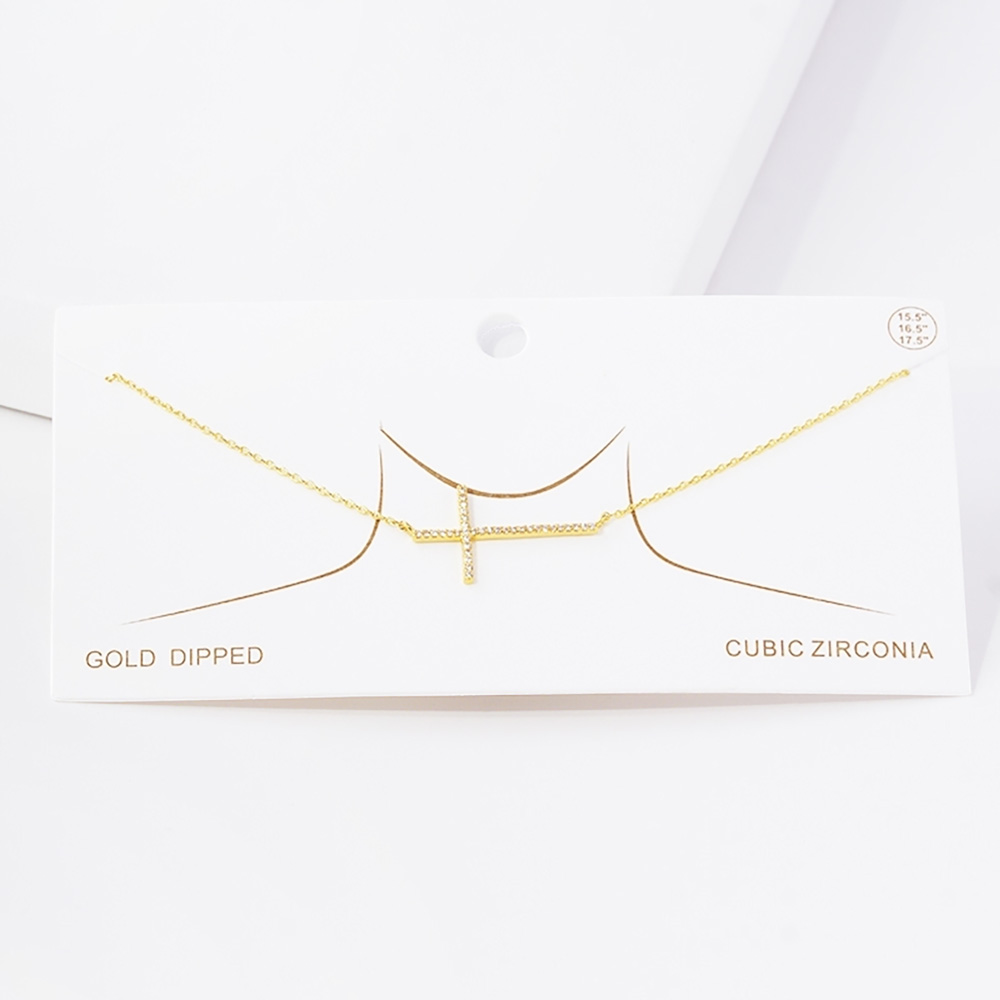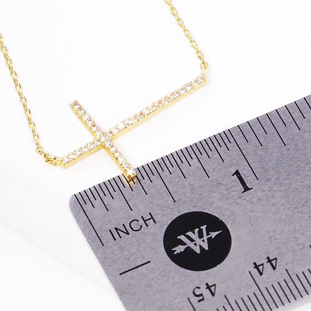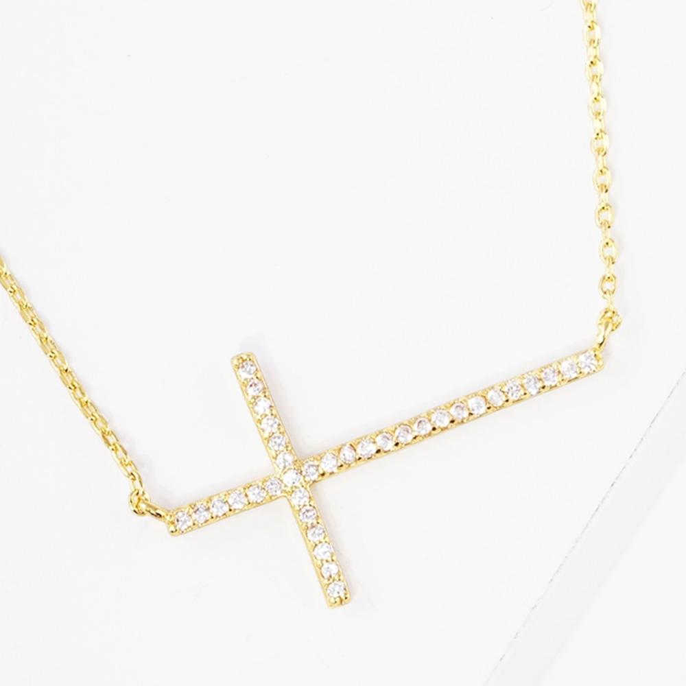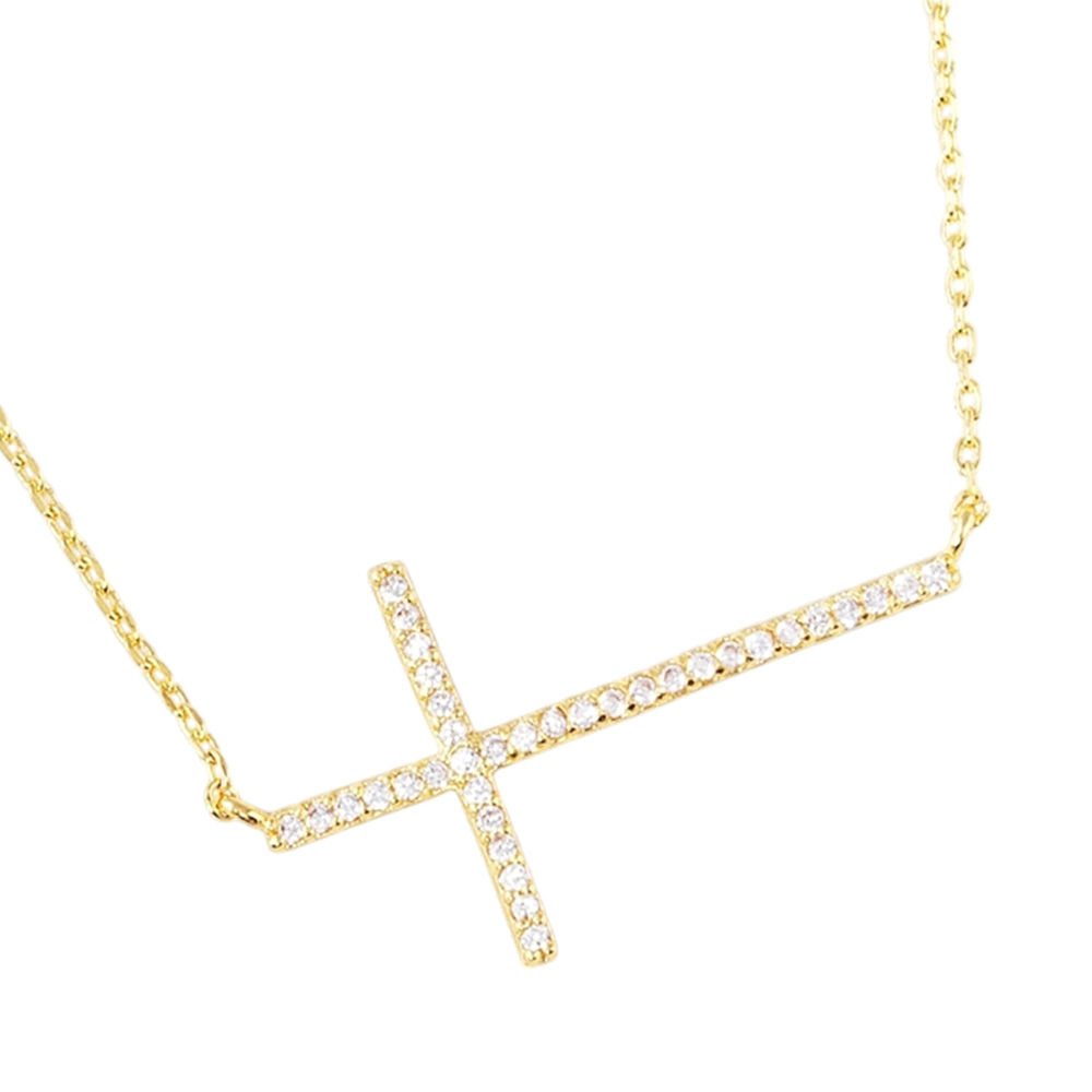 Details • Necklace Size : 16" + 2" L • Pendant Size : 1.1" X 0.6" • Showcase faith and elegance with this sideways cross necklace, accented with sparkling cubic zirconia stones. A meaningful yet stylish pendant that blends spiritual symbolism with modern fashion, perfect for daily wear or as a thoughtful gift for someone special. • Lead and Nickel Compliant • Made In Korea • Gold Dipped • CZ Cubic Zirconia