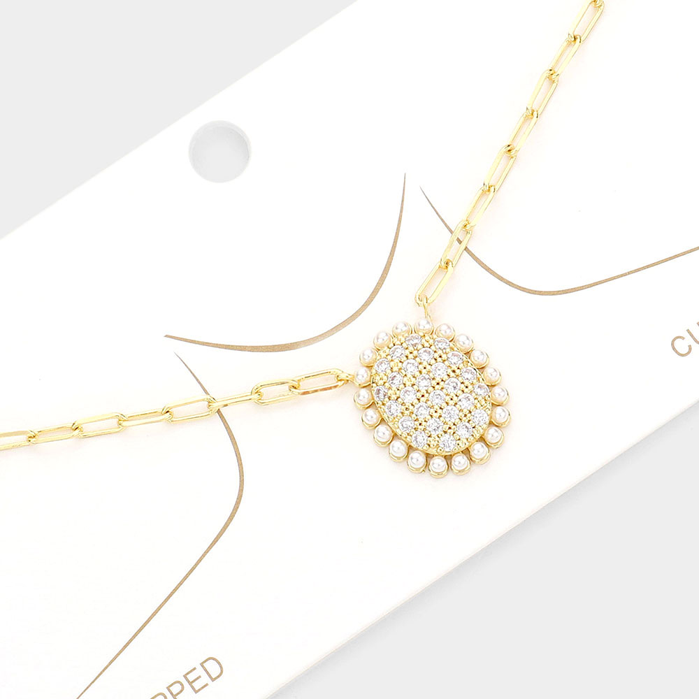 Gold Dipped CZ Stone Pearl Round Pendant Necklace