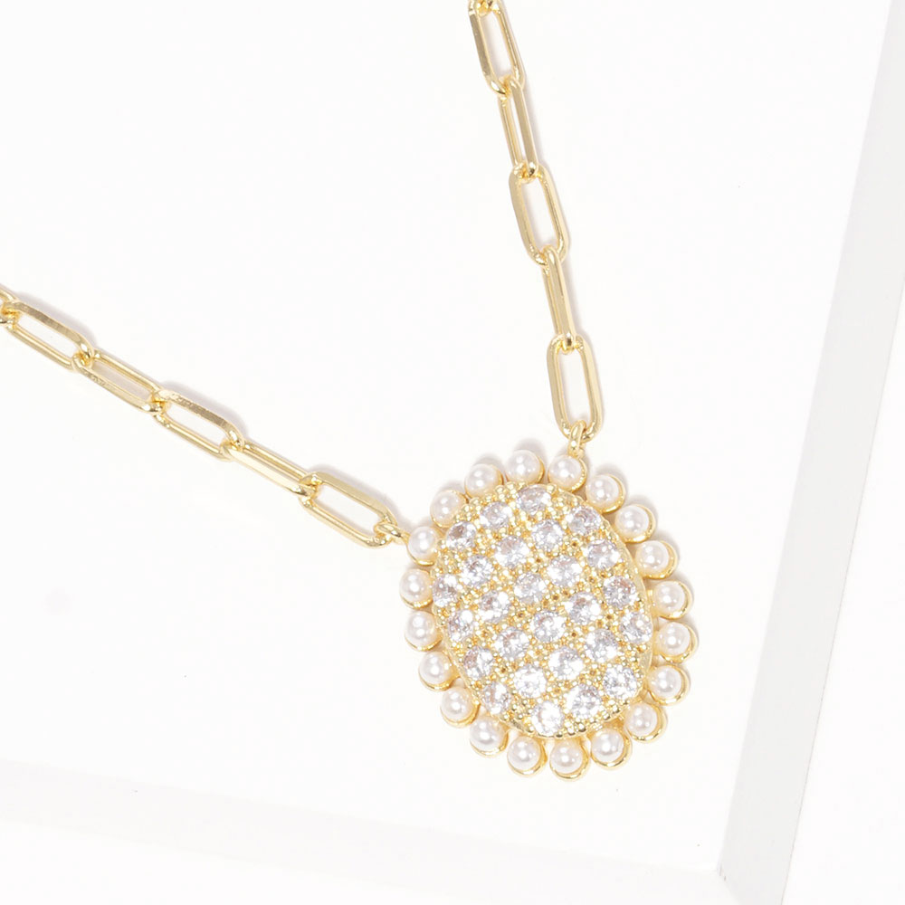 Gold Dipped CZ Stone Pearl Oval Pendant Necklace