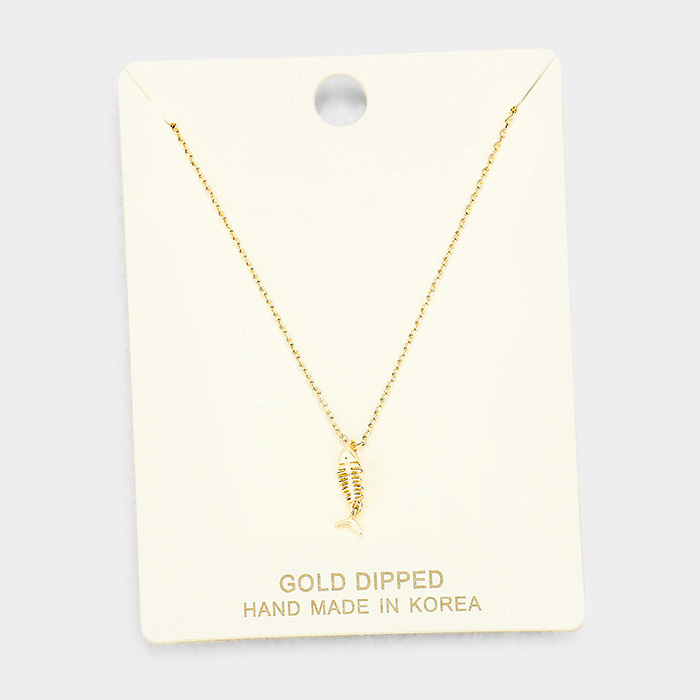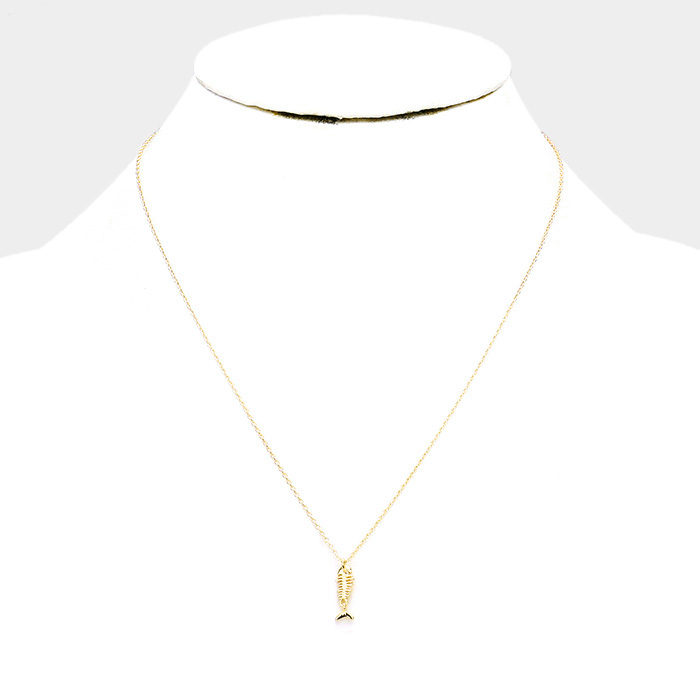 White Gold Dipped Metal Fishbone Pendant Necklace