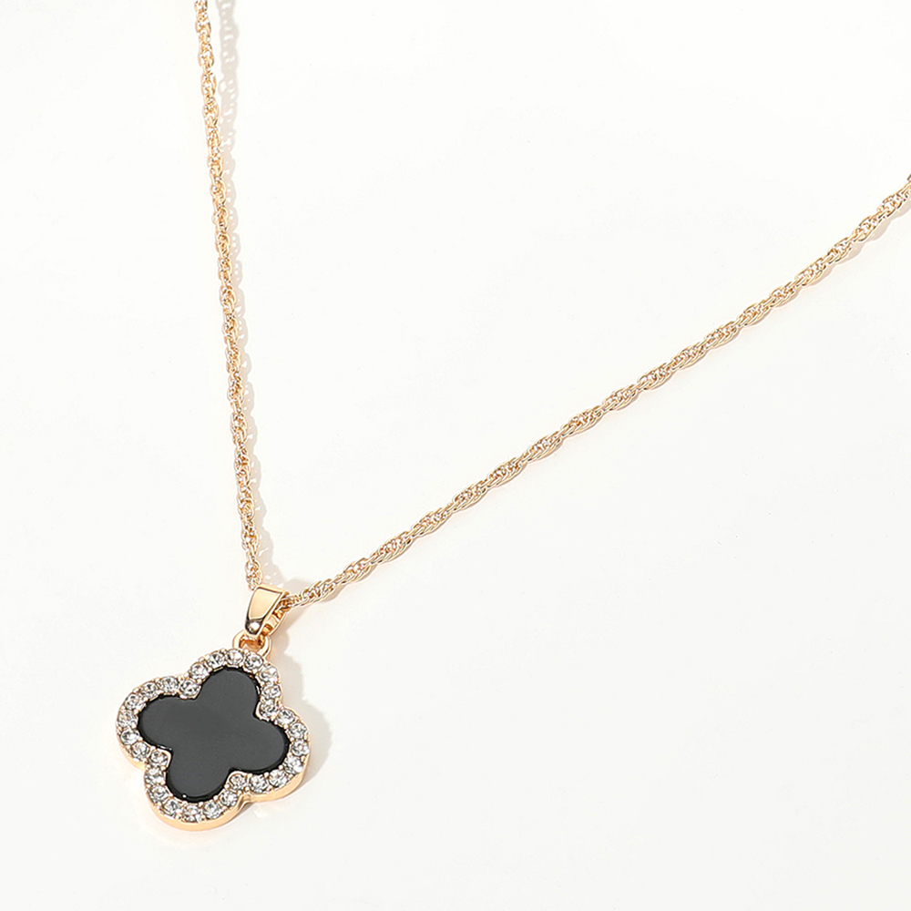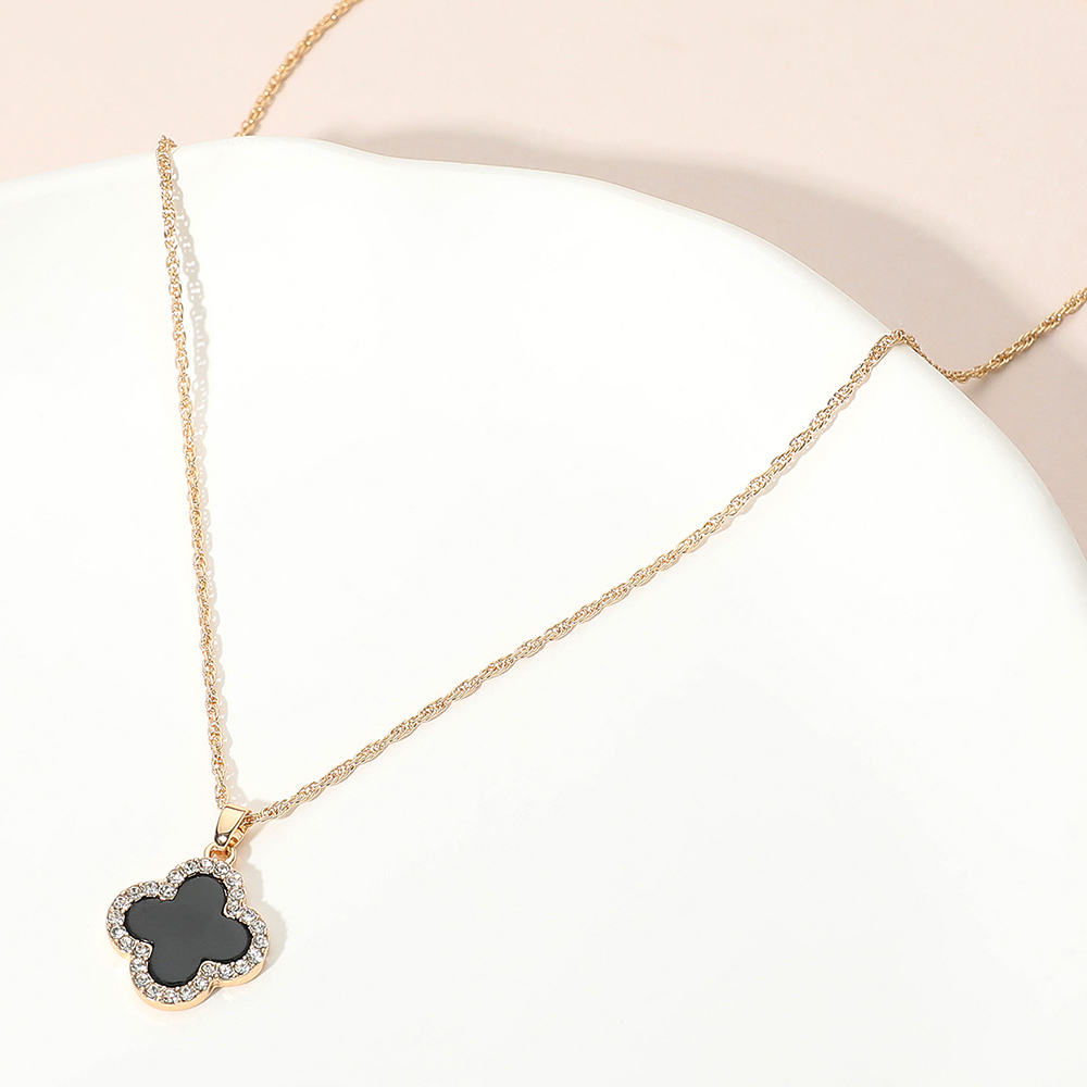 • This radiant quatrefoil outline pendant necklace features a hollow design surrounded by shimmering stones for a touch of elegance. Its delicate chain and timeless silhouette create a versatile accessory that complements both everyday wear and special occasions with effortless charm.