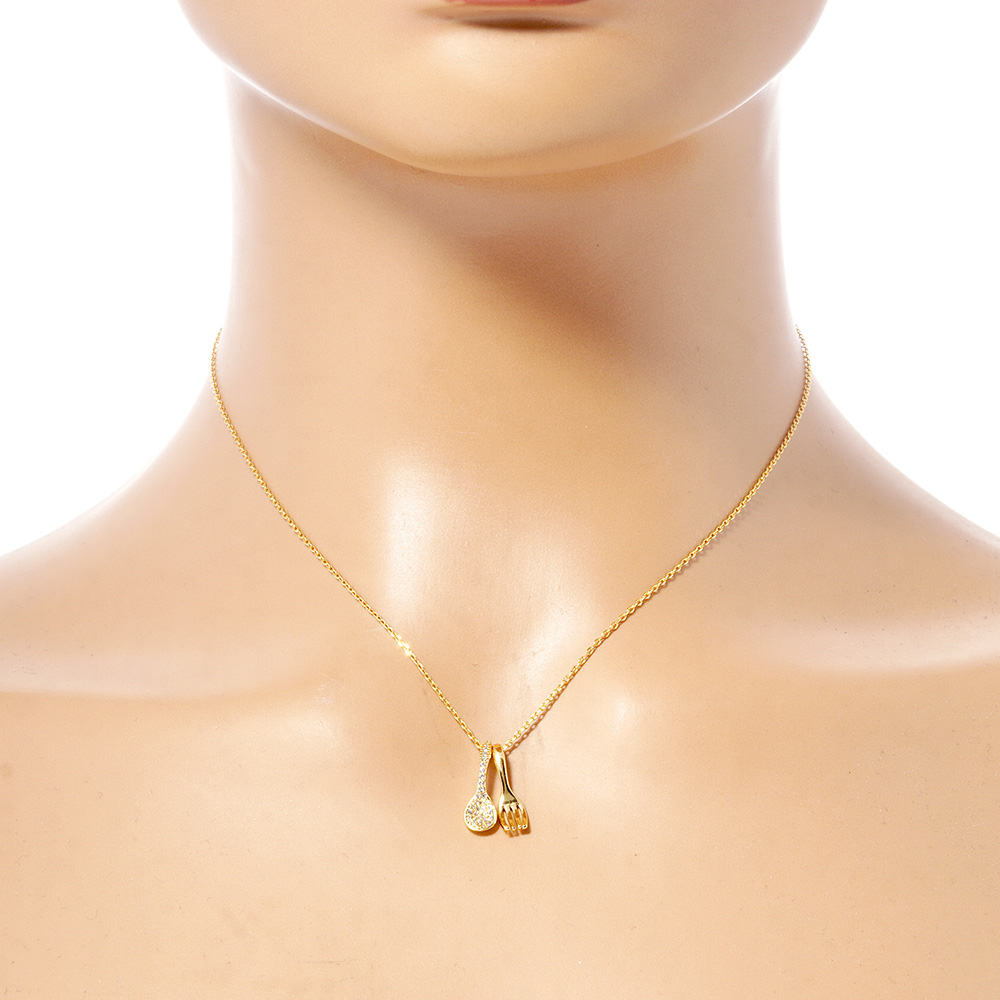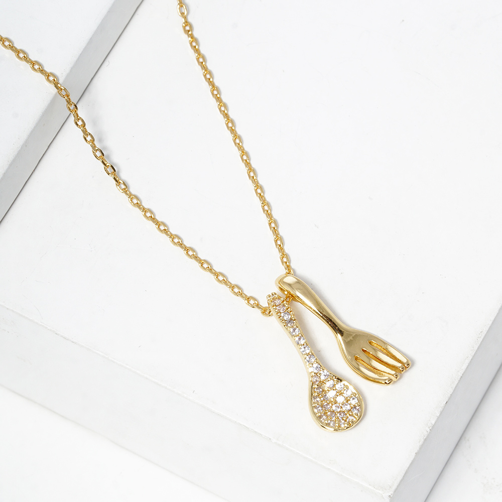 Gold Dipped Stone Paved Spoon Fork Pendant Necklace