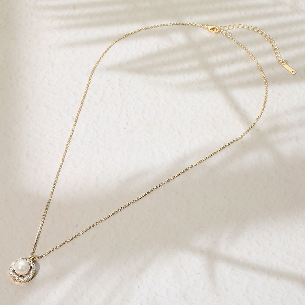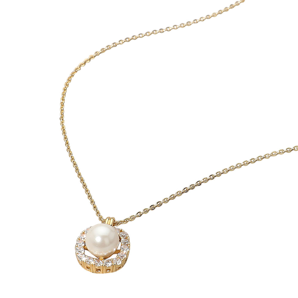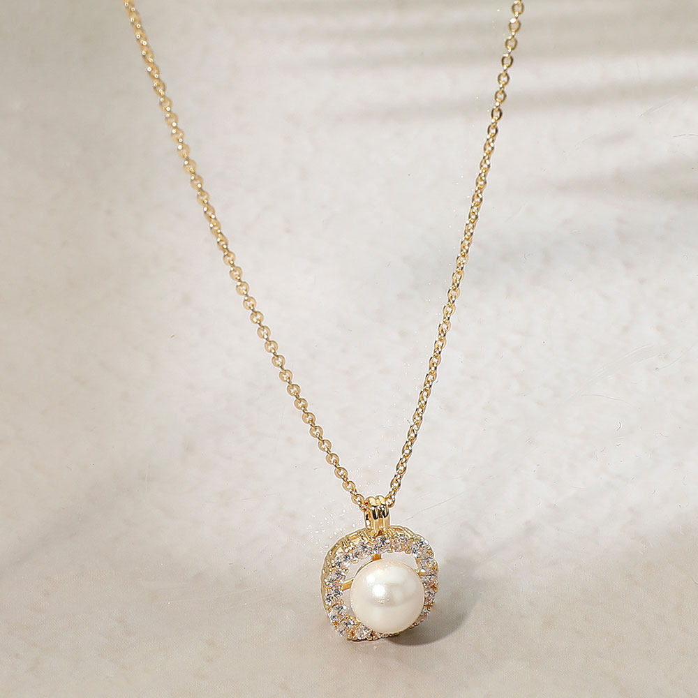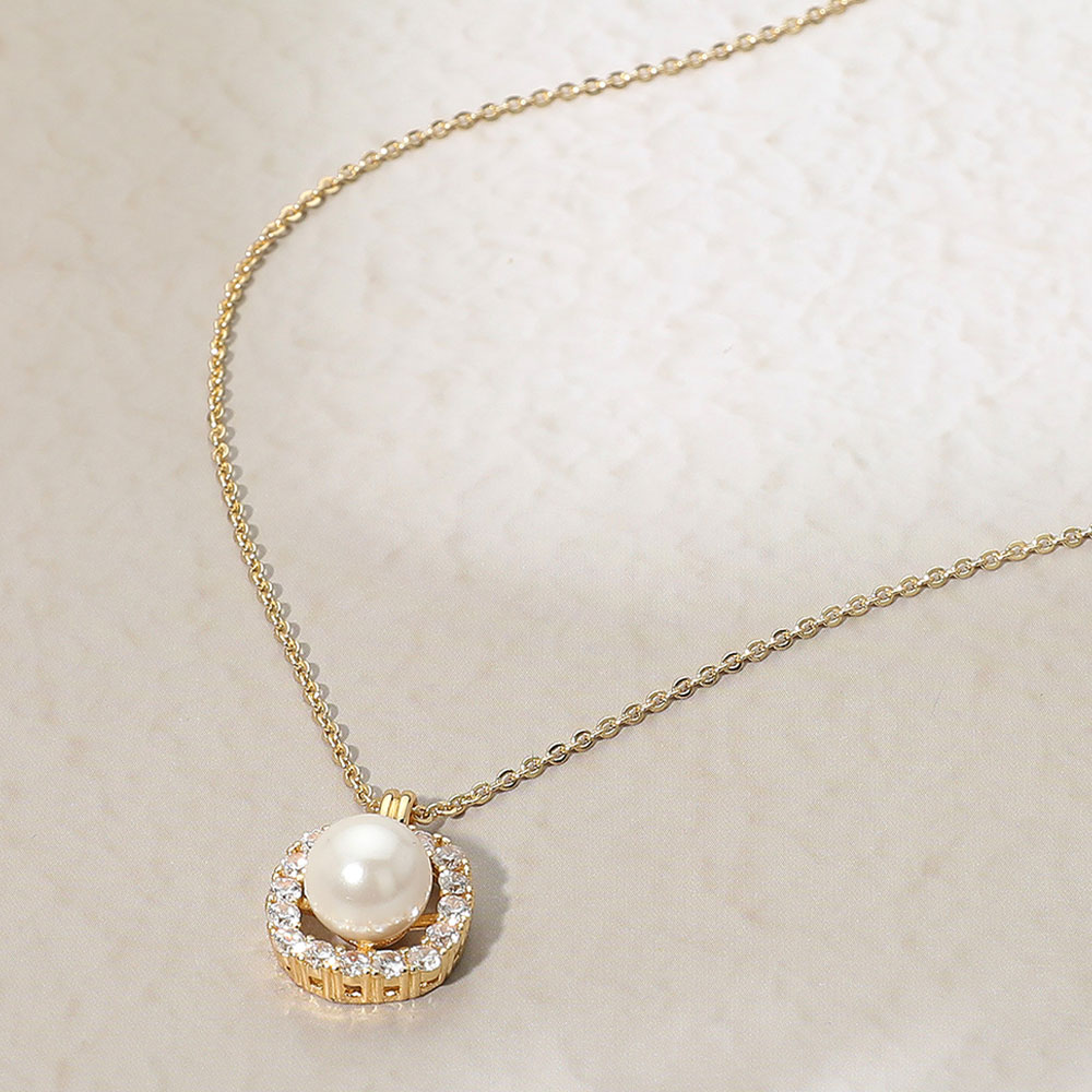 Details • Necklace Size : 18" + 3.25" L • Pendant Size : 0.5" X 0.7" • Sophisticated pendant necklace featuring a luminous pearl framed by a sparkling crystal halo. Perfect for weddings, formal events, or adding timeless elegance to everyday attire. • CZ Cubic Zirconia • Gold Dipped