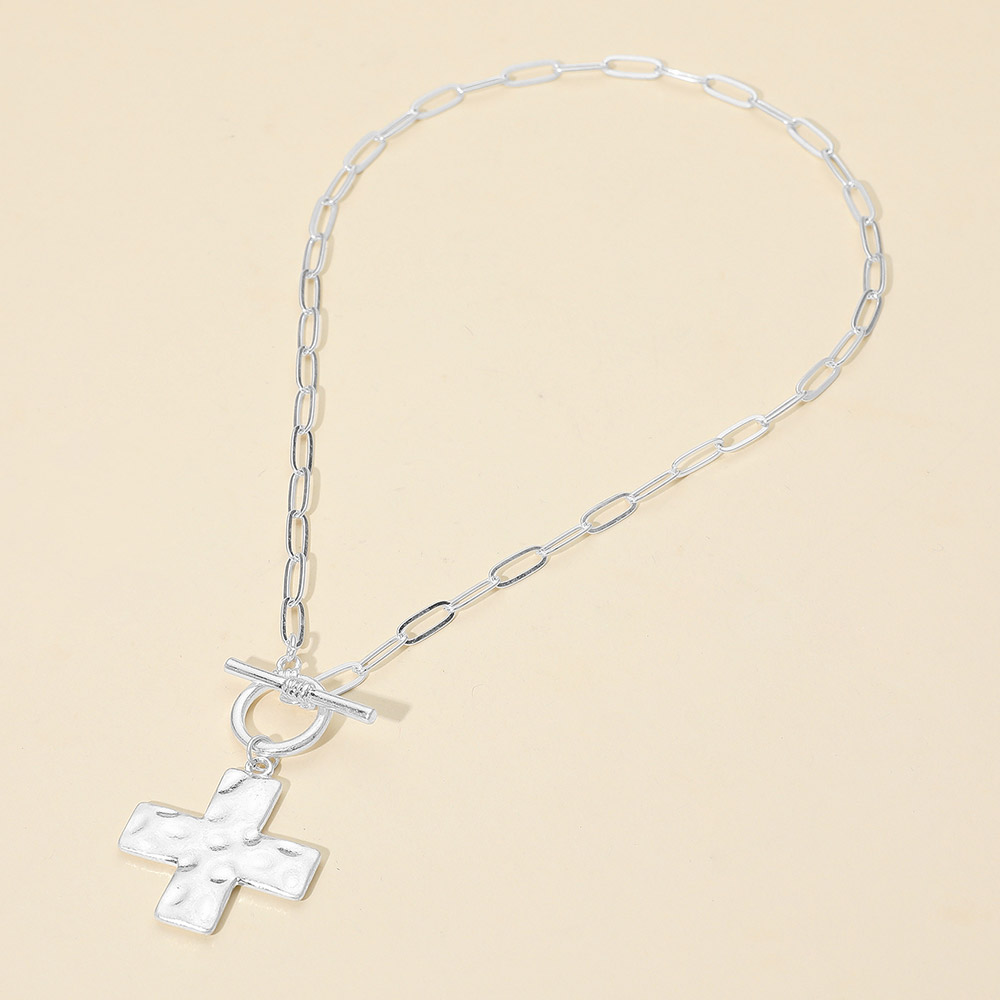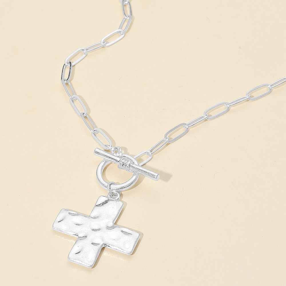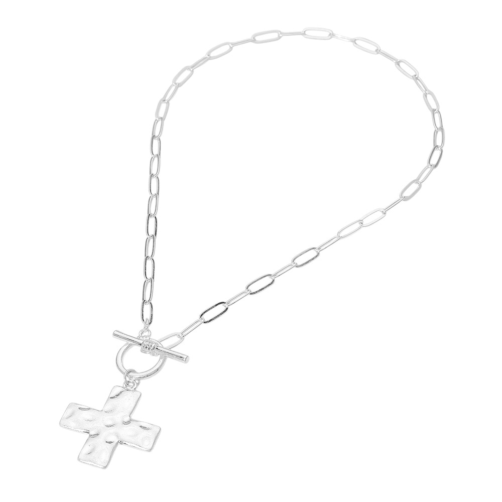 Details • Necklace Size : 17.5" L • Pendant Size : 1.25" X 1.25" • Toggle Closure • Elegant hammered cross pendant necklace with a sleek chain and toggle clasp. Perfect for layering or wearing solo, this modern piece blends timeless symbolism with contemporary design. • Lead and Nickel Compliant