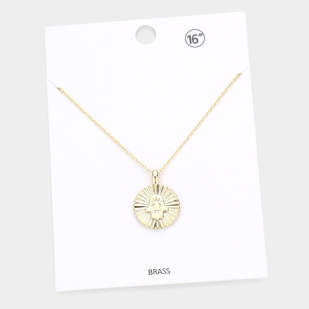 Hamsa Hand Evil Eye Accented Textured Brass Metal Round Pendant Necklace