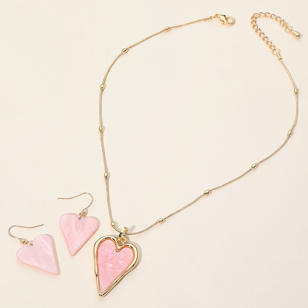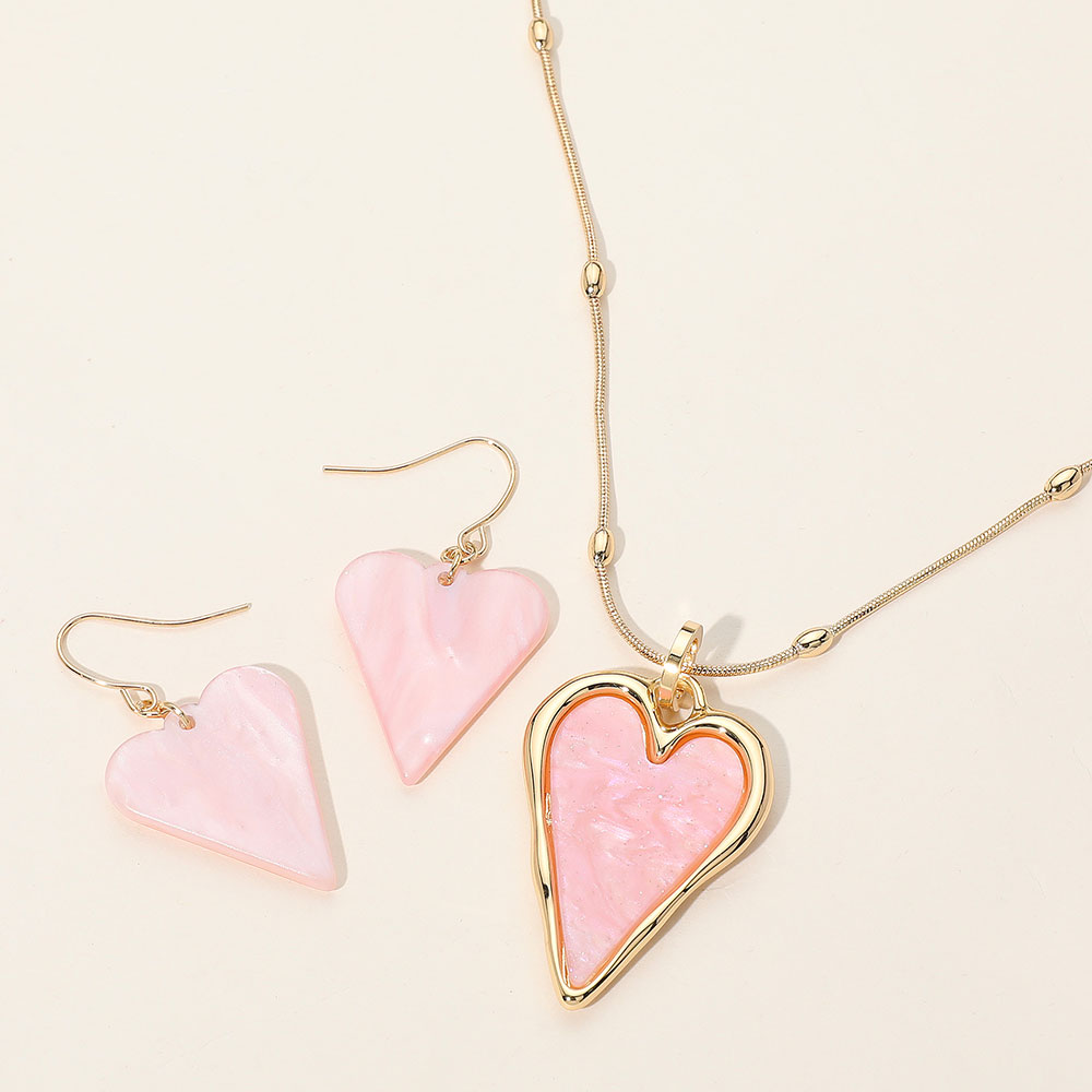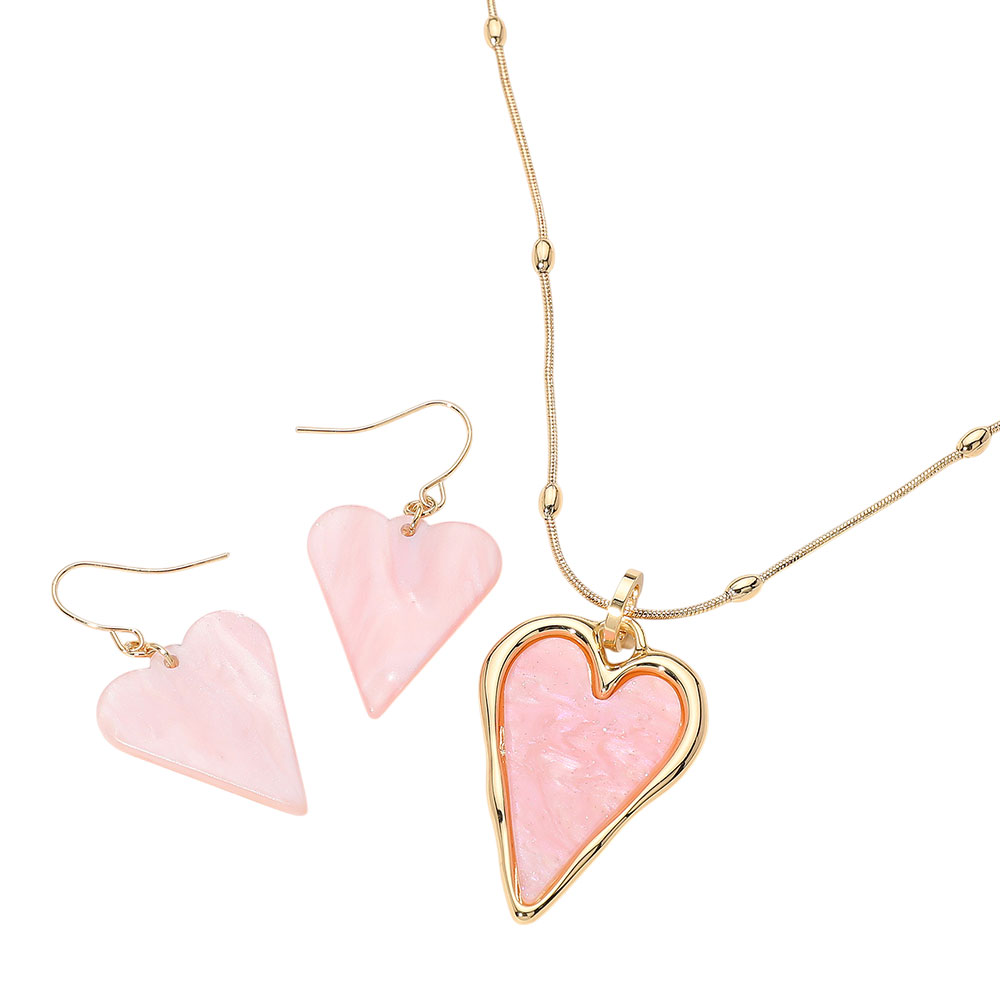 Details • Necklace Size : 18" + 2.5" L • Pendant Size : 1.2" X 2" • Earrings Size : 1.75" L • Charming heart-shaped pendant necklace paired with matching dangle earrings. A romantic and playful accessory set, ideal for everyday wear or special occasions. Lightweight and easy to style. • Lead and Nickel Compliant