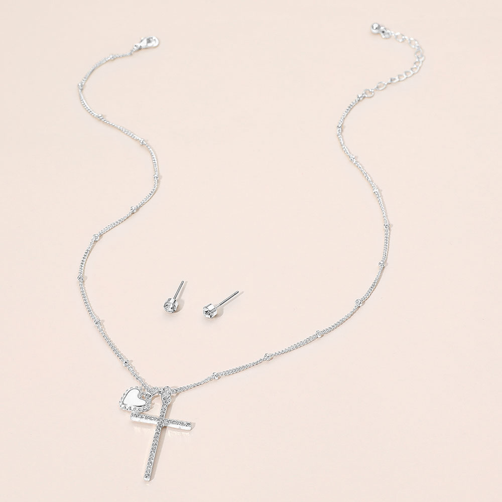 Details • Necklace Size : 16" + 2" L • Pendant Size : 0.75" X 1.25" • Earrings Size : 0.2" L • Add meaningful elegance to your look with this delicate pendant necklace featuring a heart and cross charm, paired with classic stud earrings. Perfect for everyday wear or special moments, this set brings a subtle shine and thoughtful style to any outfit. • Lead and Nickel Compliant