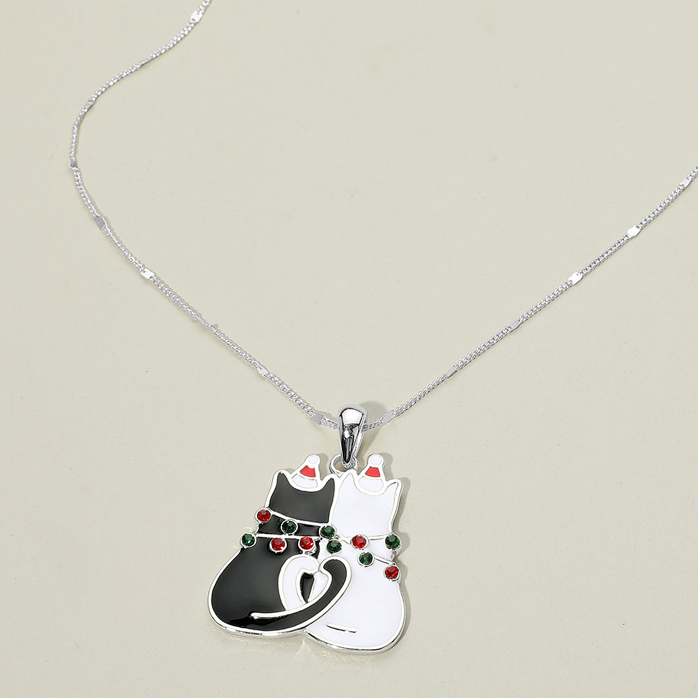 Details • Necklace Size : 18" + 3" L • Pendant Size : 1.25" X 1.75" • Charming cat couple pendant necklace featuring two cats adorned with festive details. Perfect for cat lovers, this playful and elegant piece adds a whimsical touch to everyday wear or special occasions. • Lead and Nickel Compliant