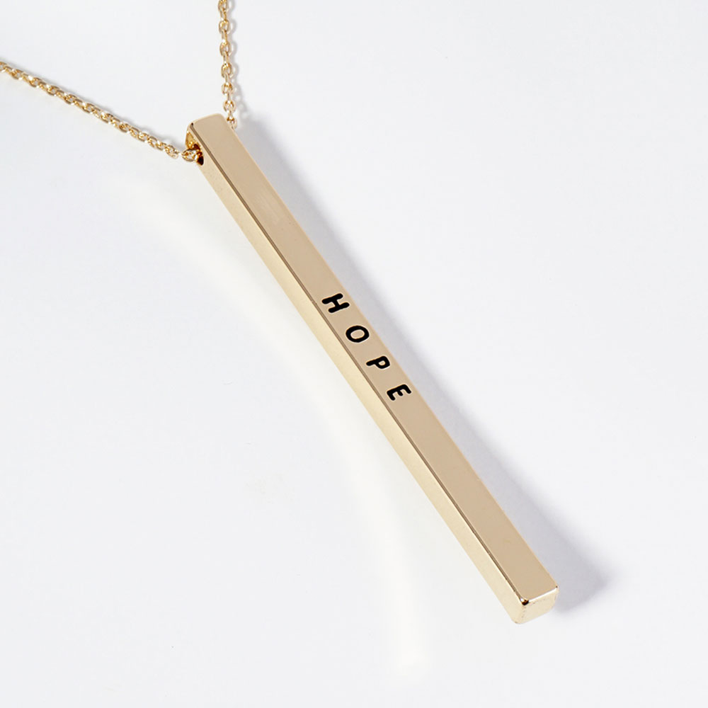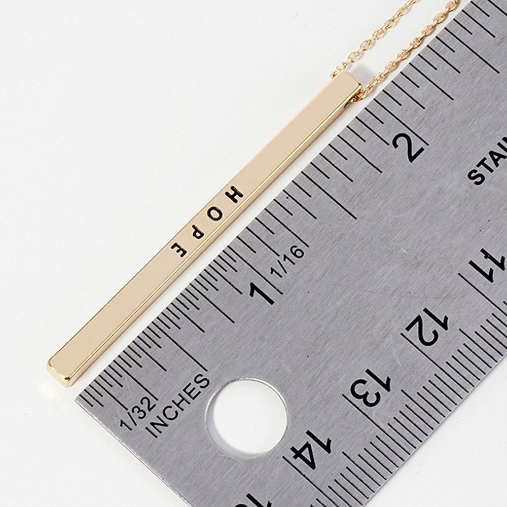 Details • Necklace Size : 19.5" + 2" L • Pendant Size : 0.2" X 2" • Minimalist vertical bar pendant necklace engraved with “HOPE.” A meaningful accessory symbolizing strength and optimism—perfect for everyday wear or as an uplifting gift for someone special. • Lead and Nickel Compliant • Brass