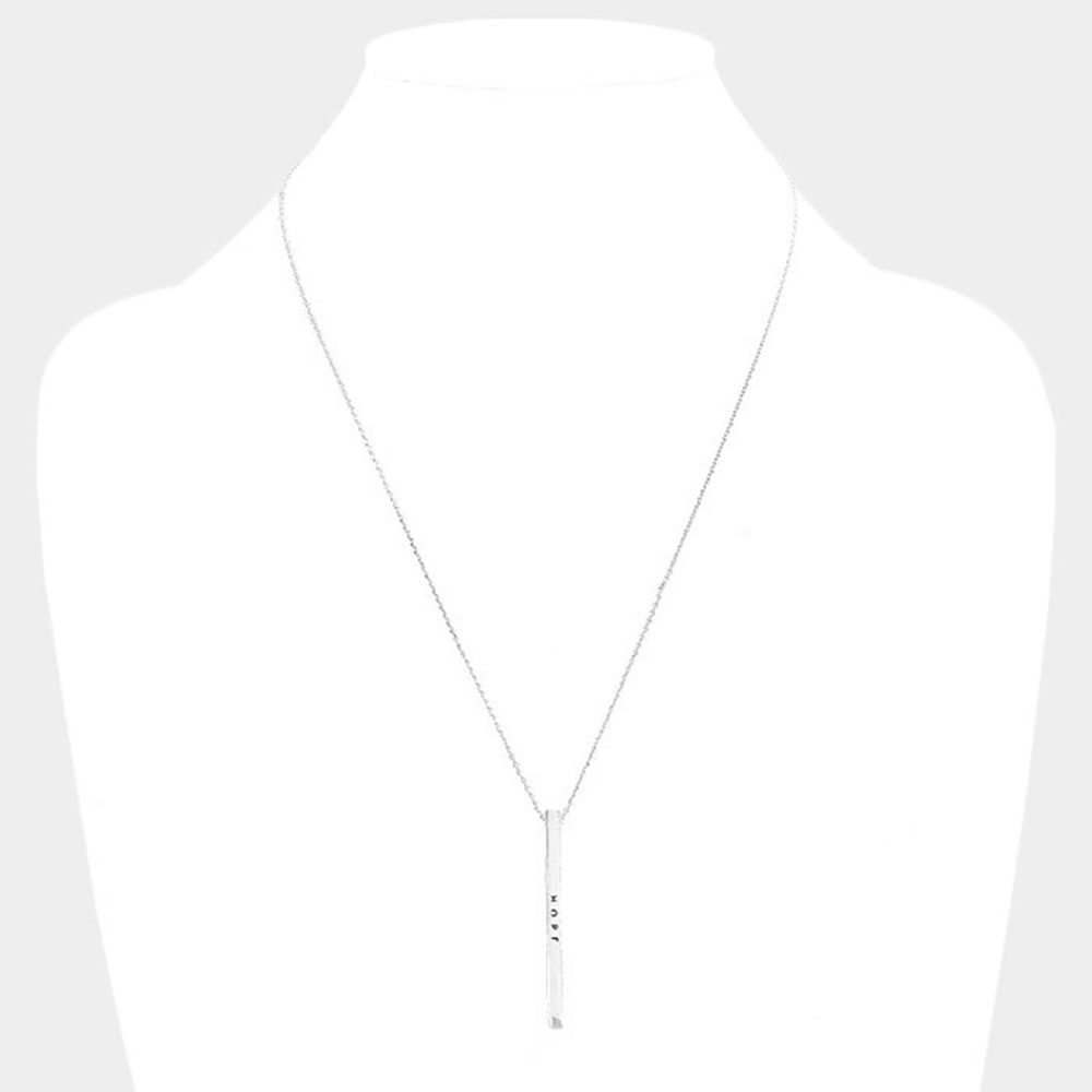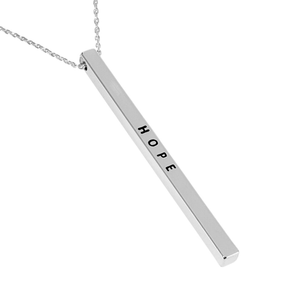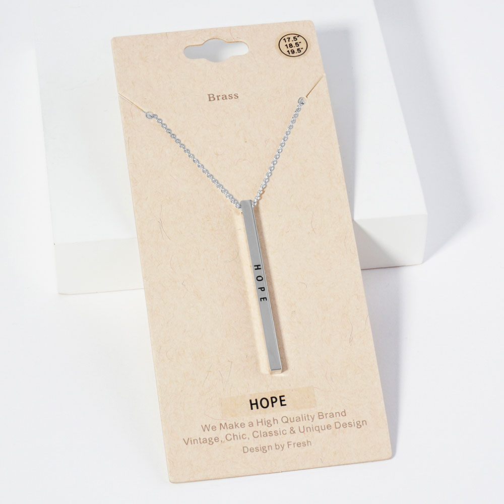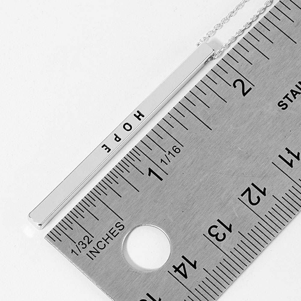 Details • Necklace Size : 19.5" + 2" L • Pendant Size : 0.2" X 2" • Minimalist vertical bar pendant necklace engraved with “HOPE.” A meaningful accessory symbolizing strength and optimism—perfect for everyday wear or as an uplifting gift for someone special. • Lead and Nickel Compliant • Brass
