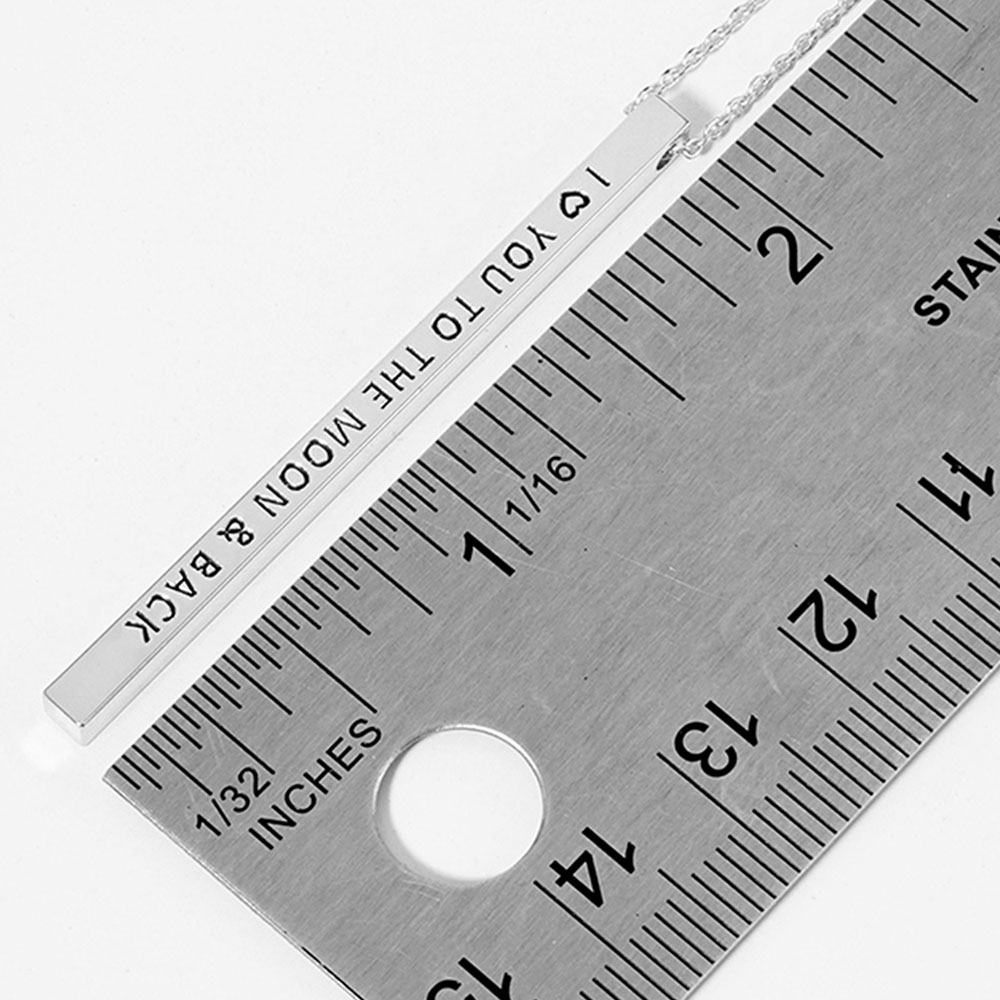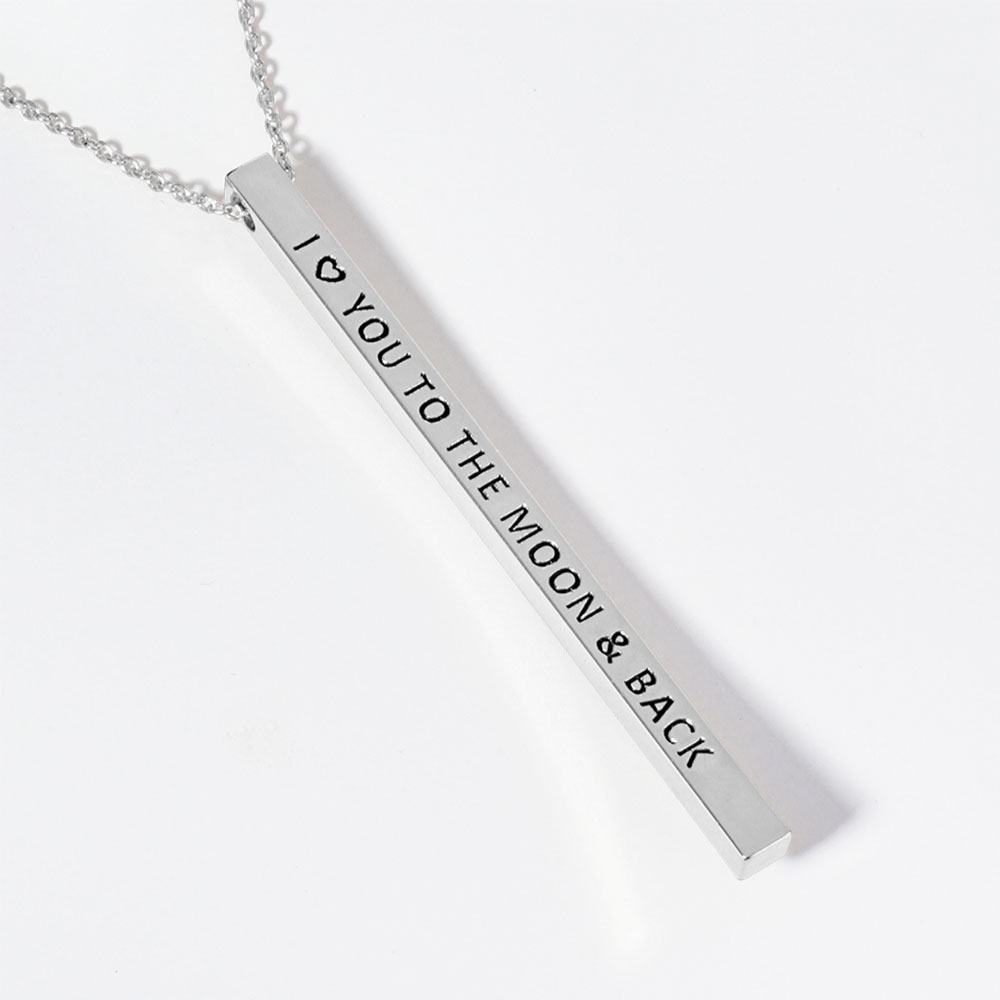 Details • Necklace Size : 19.5" + 2" L • Pendant Size : 0.2" X 2" • Celebrate boundless affection with this vertical bar necklace engraved with “I ❤️ YOU TO THE MOON & BACK.” A heartfelt gift that captures deep emotional connection, perfect for anniversaries, birthdays, or everyday reminders of love that knows no limits. • Lead and Nickel Compliant • Brass