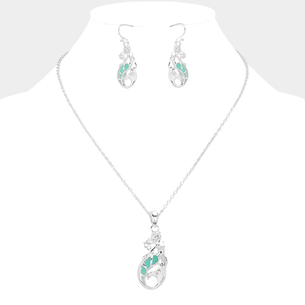 Details • Necklace Size : 18" + 2.5" L • Pendant Size : 1.8" L • Earrings Size : 1.3" L • Elevate your look with this mermaid pendant jewelry set featuring a unique mythical creature design. Complete with matching earrings, this set adds bold, fantasy-inspired style to any outfit for everyday wear or themed occasions. • Lead and Nickel Compliant