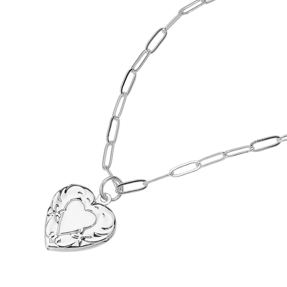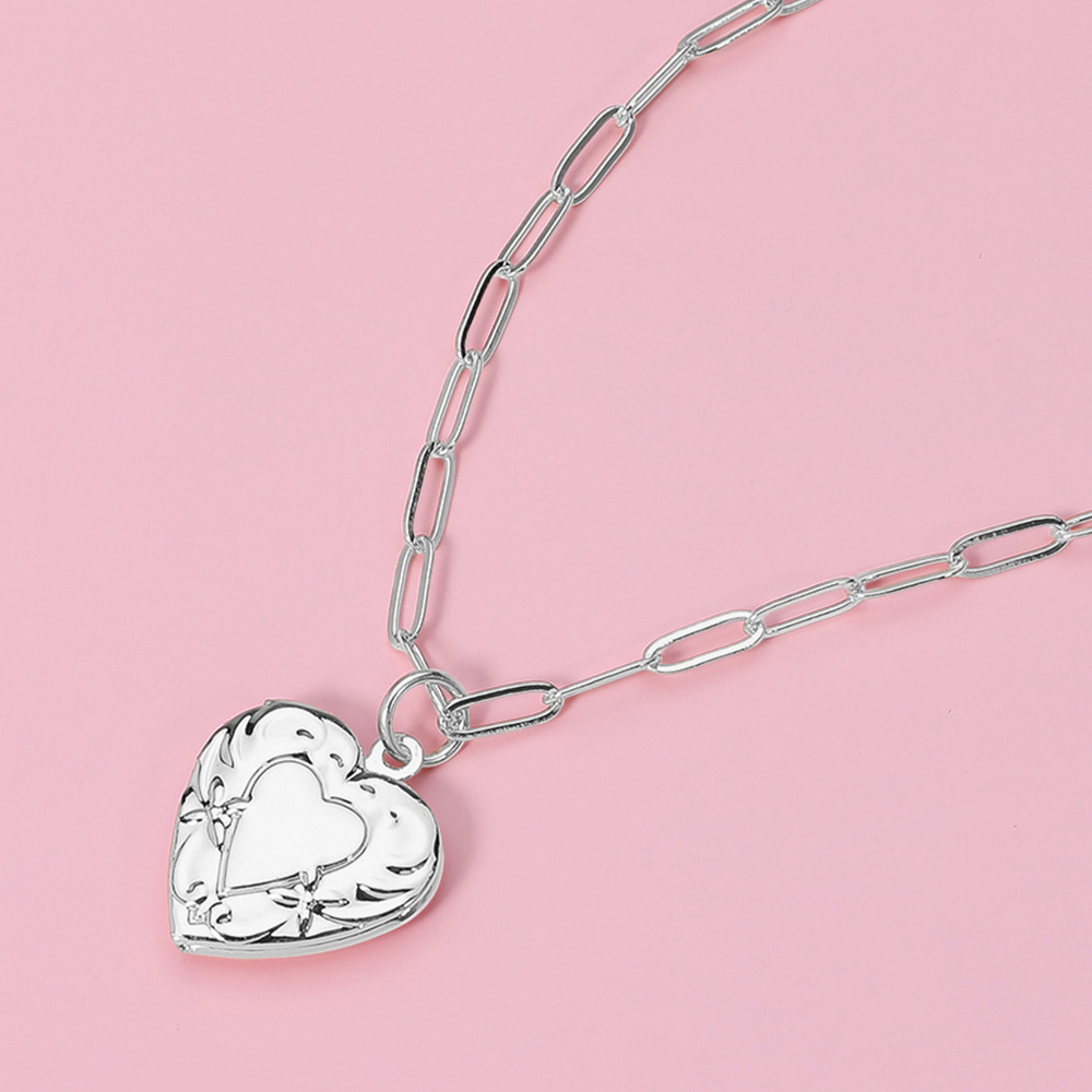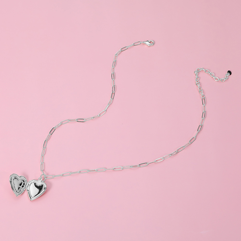 Metal Heart Locket Pendant Paperclip Chain Necklace