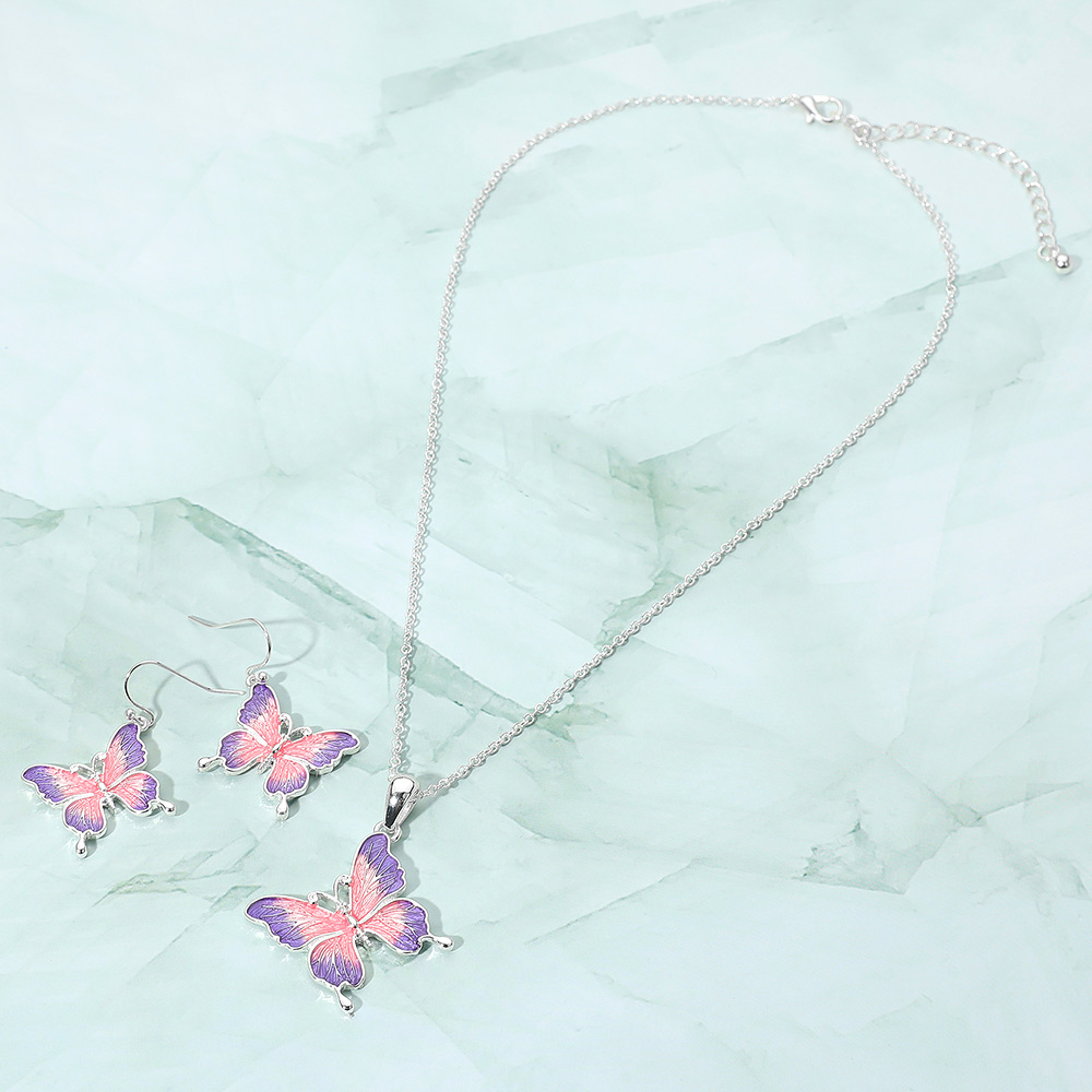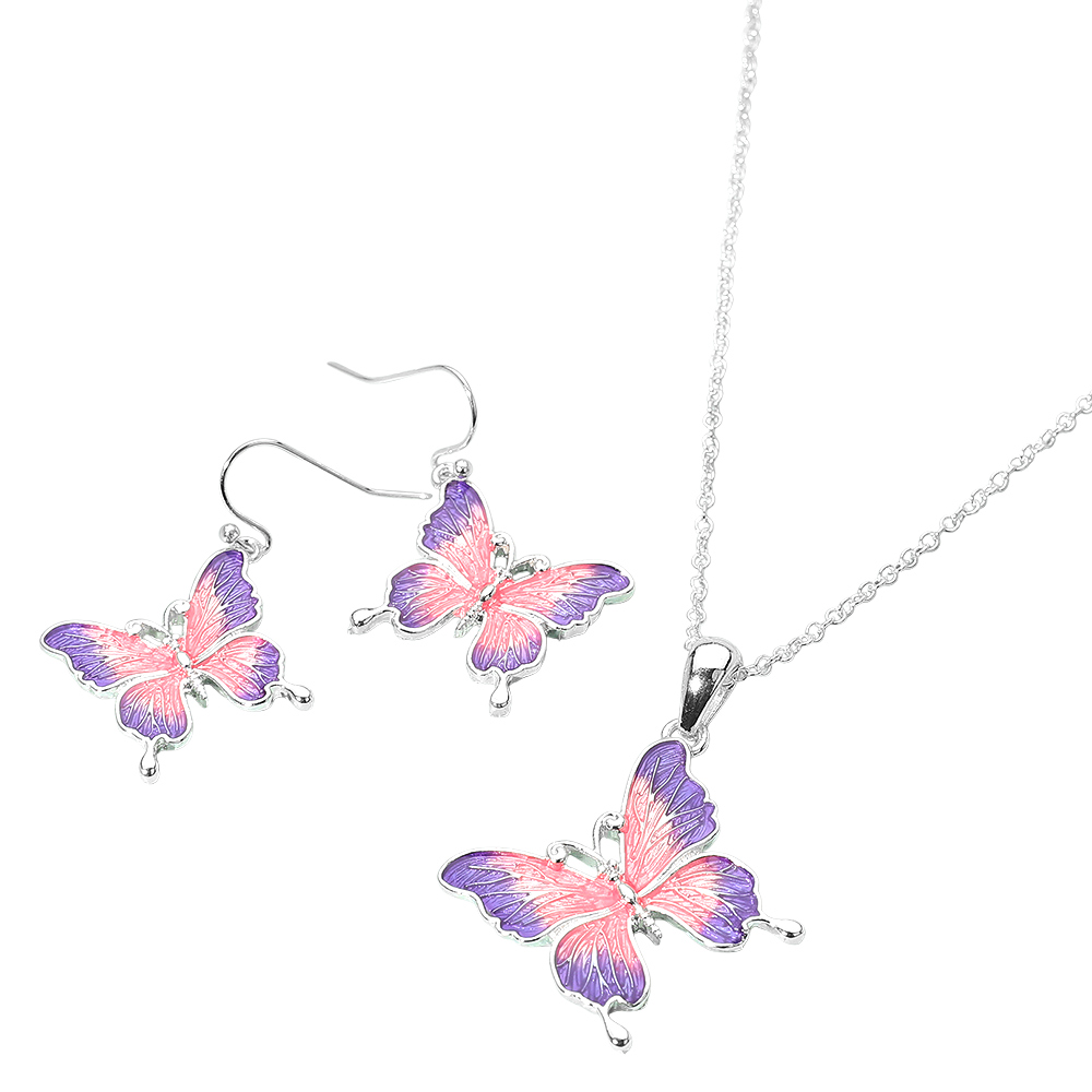 • This butterfly enamel necklace and earring set captures the beauty of transformation with its delicately detailed design. Perfectly coordinated for a polished look, it adds a touch of grace and charm to any outfit, making it ideal for both everyday wear and special occasions.
