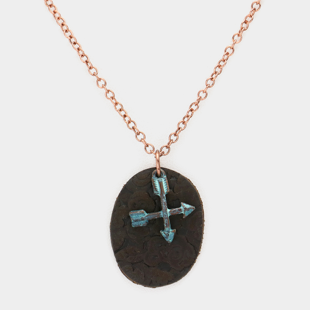 Oval Faux Leather Metal Arrow Pendant Necklace